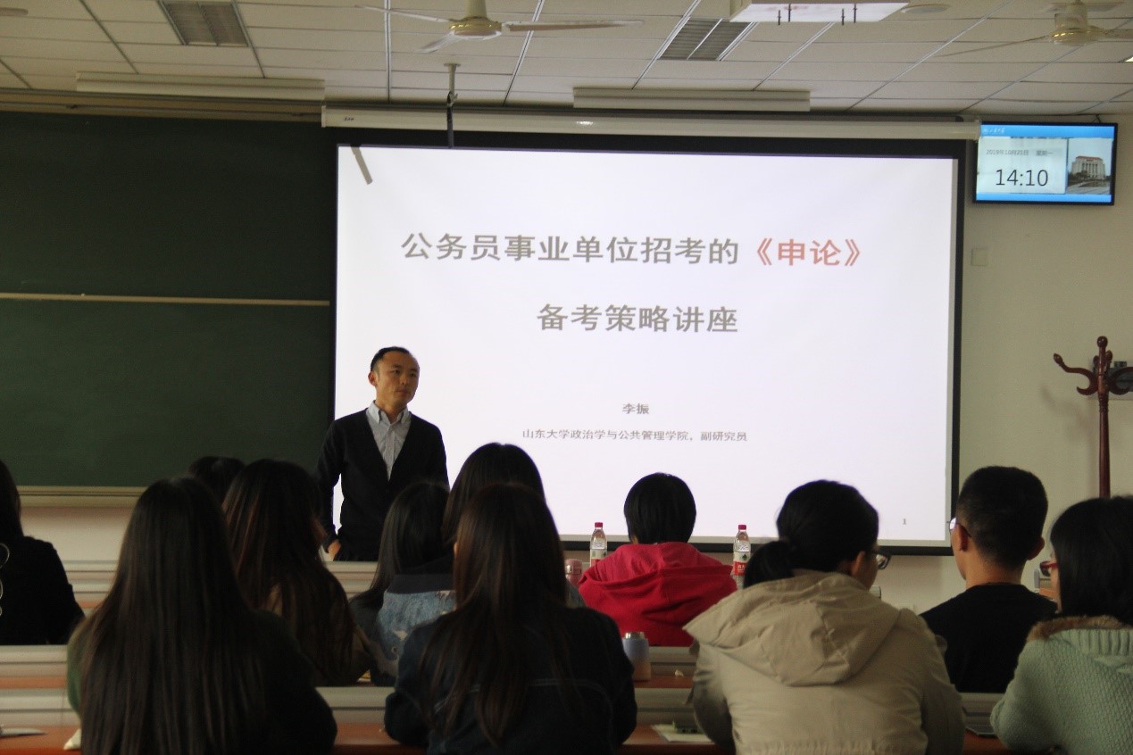 为提高同学们的《申论》写作水平,使同学们掌握有效的写作技巧,10月21日下午,8858cc永利在振声苑S306教室举办公务员事业单位《申论》备考策略讲座。本次讲座由8858cc永利、展翼助翔工作室主办,8858cc永利研究生会承办。讲座特邀8858cc永利副研究员李振老师担任主讲人,对公务员事业单位《申论》备考策略进行分析与讲解。