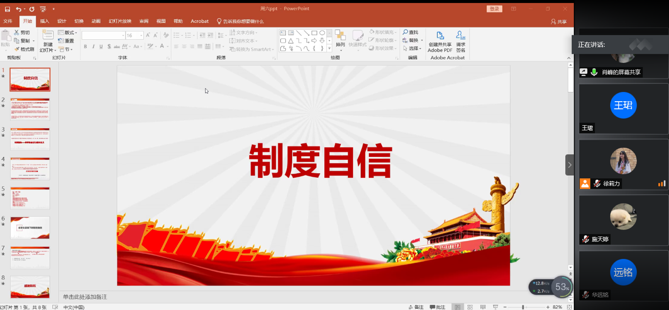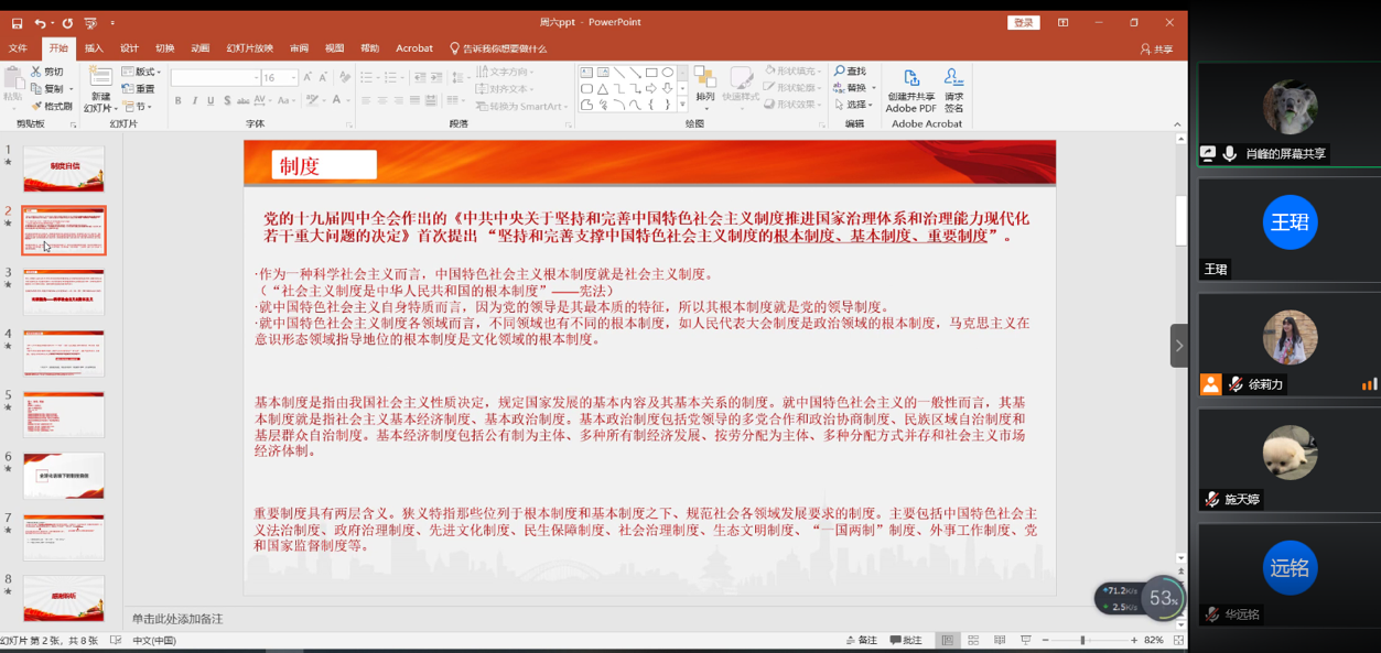与会成员认真学习,并进行提问与讨论,第三次理论学习会议圆满结束。在两位党员的引领和共同努力之下,团队全体成员都对制度自信等相关理论有了更为深入的认识和了解,为后期宣传视频的制作和推文的制作奠定了良好的基础。