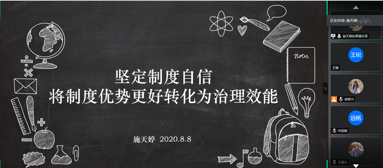 8月10日上午,8858cc永利“山盟青声”线上关于绽放战疫青春·坚定制度自信理论宣讲团通过线上形式就中国特色社会主义制度优势相关内容召开第三次理论学习会议,本次会议由团队内两位党员肖峰与施天婷同学带领团队成员进行理论学习。