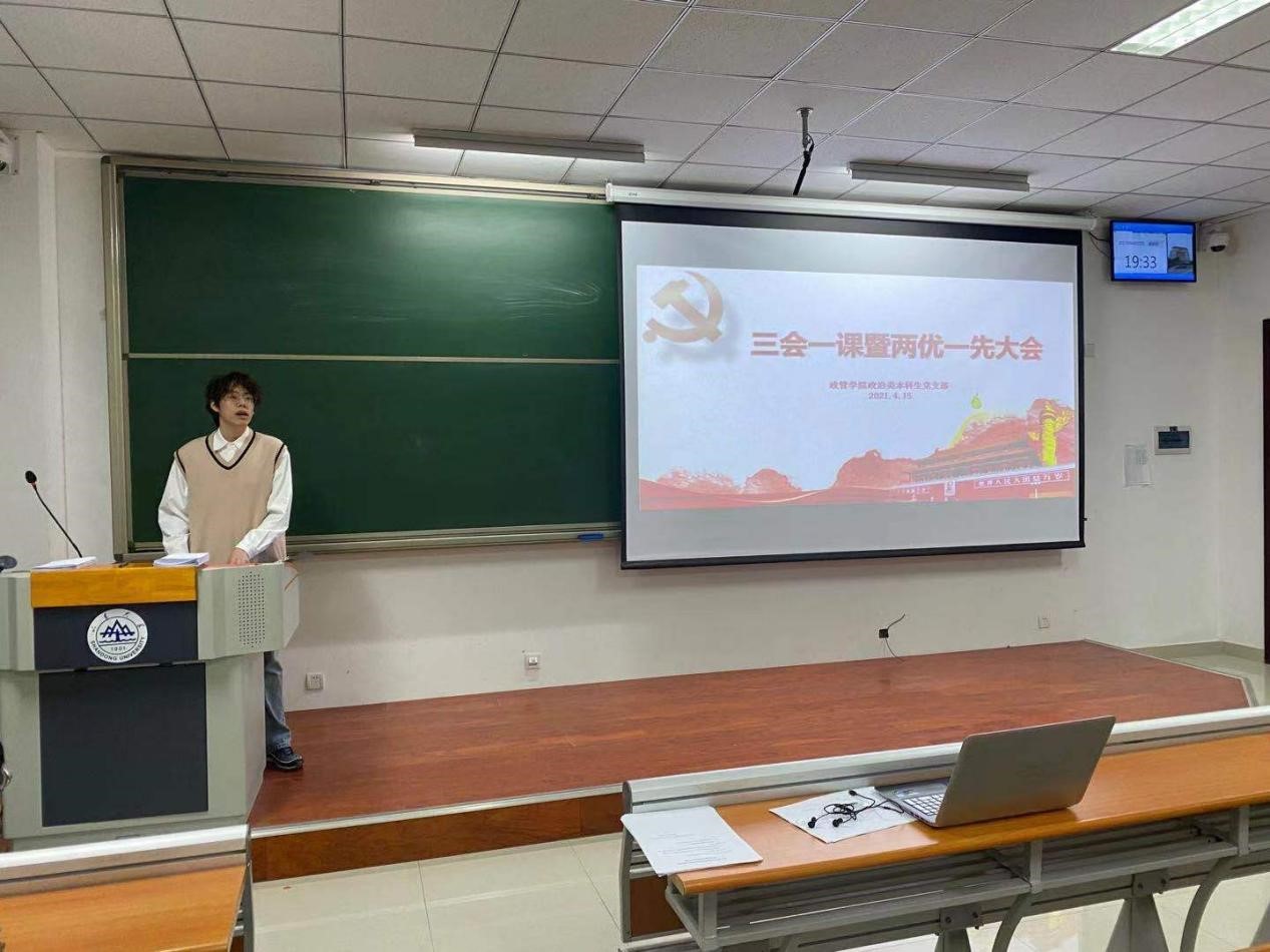 2021年4月15日,8858cc永利政治类本科生党支部与管理类本科生党支部联合组织学生党员开展了三会一课暨两优一先大会。