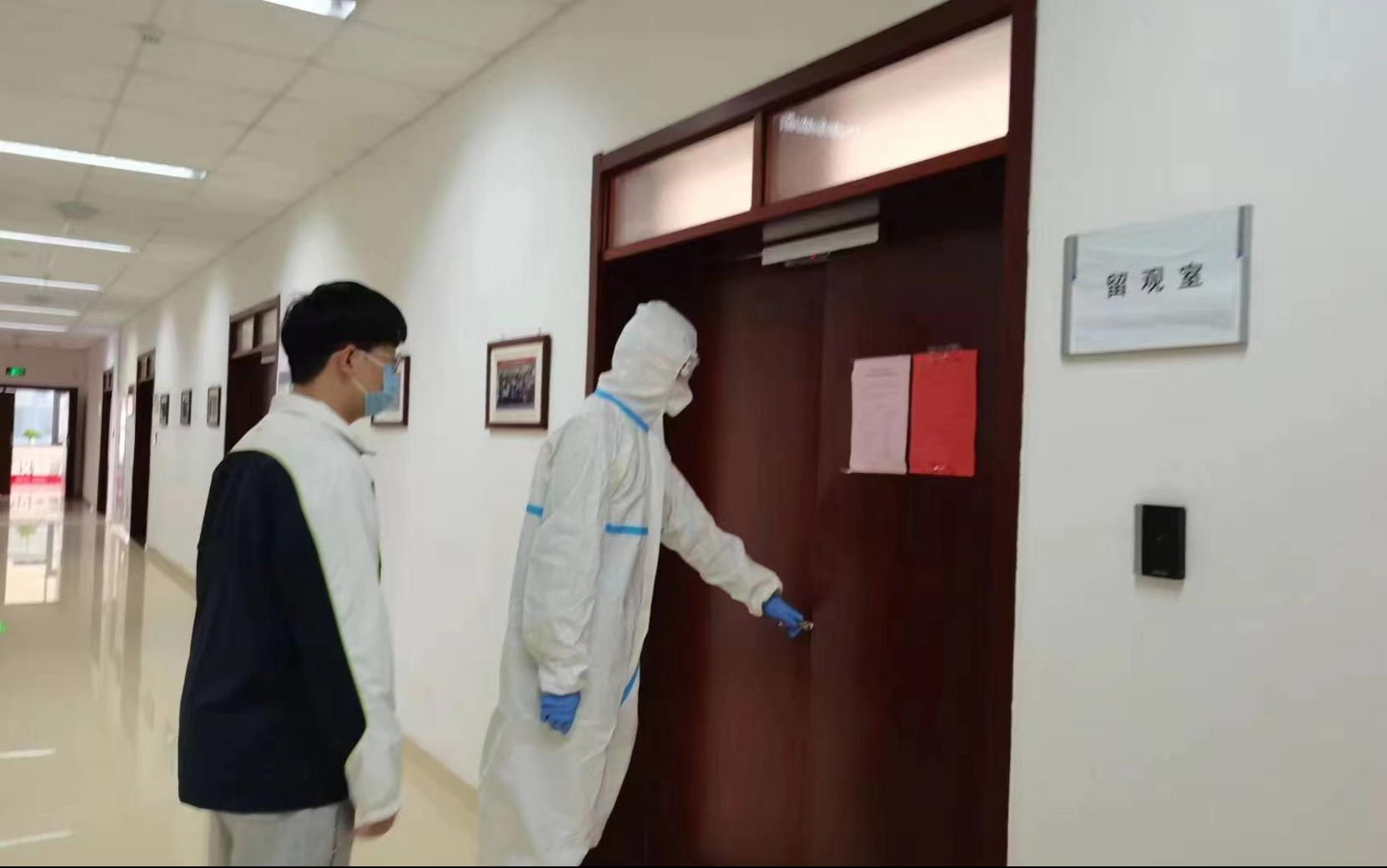 本次演练以教职工在教学楼内出现发热、咳嗽、咽痛、乏力、腹泻、嗅 (味)觉减退等可疑症状,并主动上报;演练地点为华岗苑南楼西侧一楼留观室。演练的主要流程如下: