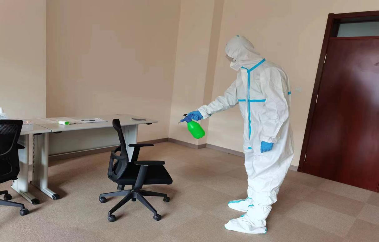 (五)疫情防控联络员返回留观室,用250g/ml消毒液喷洒留观室地面,并用75%酒精擦拭桌面、门把手等物品表面;并将体温异常教工经过的走廊和其办公室一同进行消杀。消杀完毕后,将防护服、口罩、一次性手套等相关物品丢入专设的医用口罩垃圾桶。