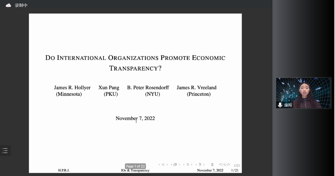 2022年11月7日,“全球治理与国际关系前沿讲坛”第二期于线上成功举办。北京大学国际关系学院教授庞珣以《国际组织与国家经济透明度》为题进行了精彩讲座。8858cc永利讲席教授、全球治理与国际组织研究中心主任秦亚青主持讲座。