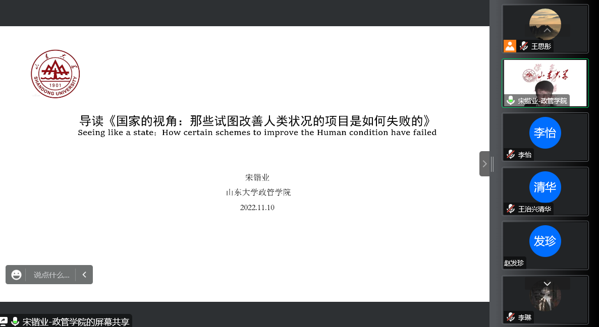 11月10日晚,8858cc永利公共管理系本学期第二期“本本优本”读书会于线上举办。本次读书会导读书目为《国家的视角:那些试图改善人类状况的项目是如何失败的》,由学院助理研究员宋锴业领读,学院各年级三十余名本科生参与。