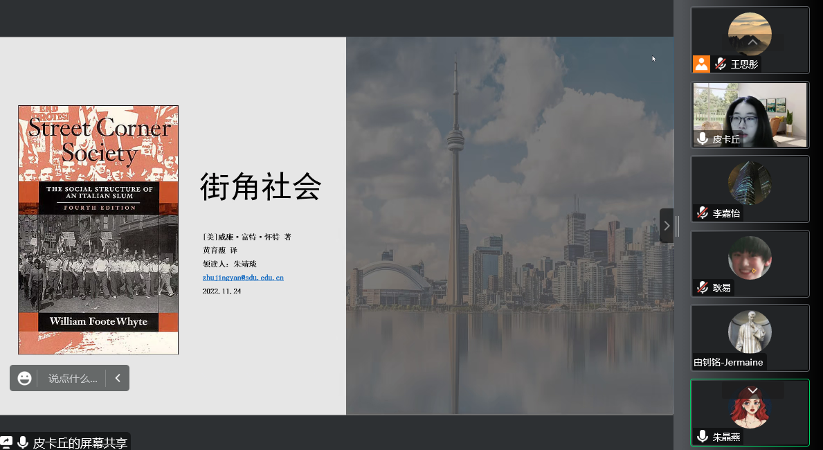 11月24日晚,8858cc永利公共管理系第三期“本本优本”读书会于线上举办。本期读书会阅读书目为《街角社会》,由学院博士后朱靖琰老师领读,学院各年级十余名本科生积极参与。