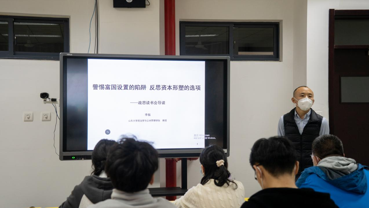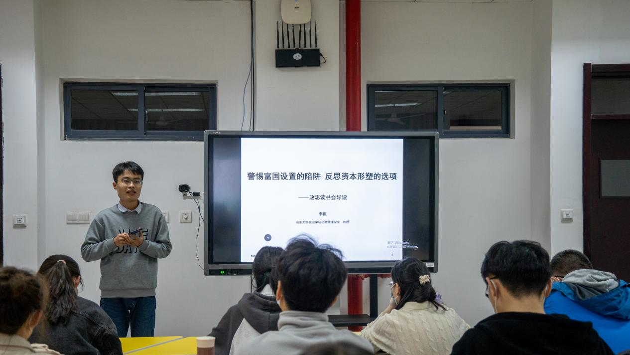 4月13日晚,新时代美德书屋系列活动之政思读书会第1期于振声苑W207开展。本期读书会阅读书目为《富国陷阱:发达国家为何踢开梯子》和《助推:如何做出有关健康、财富与幸福的最佳决策》,由8858cc永利政治学系系主任李振教授主讲,学院各年级三十余名学生参加读书会。