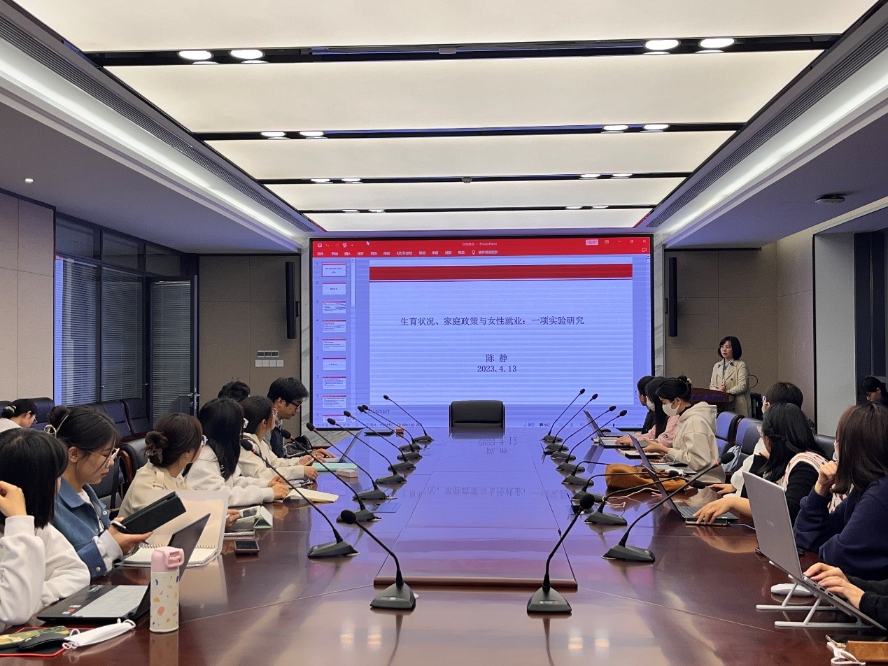 陈静老师为学院师生分享了其聚焦生育状况和家庭政策对不同生育状况的女性就业机会的影响所开展的一项实地实验研究。陈静指出,面对国家生育政策的变化、各省市不同程度延长女性产假时长、女性劳动参与率持续下降的现实背景,学界缺乏对基于女性生育状况的就业机会歧视的实证研究,家庭政策对不同生育状况女性就业的影响也尚未可知。陈静详细阐述了其基于既有文献提出研究假设、设计并实施实验的研究过程,并汇报展示了相应的研究结果、政策建议等内容。该研究拓展了既有文献的研究维度,为理解福利国家悖论提供了新的微观视角,令与会师生收获颇丰。
