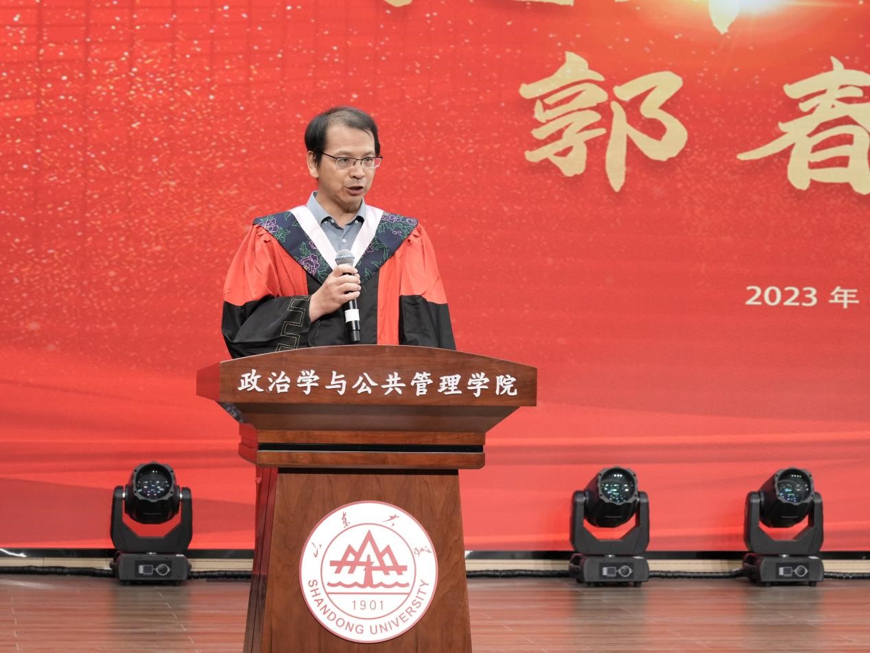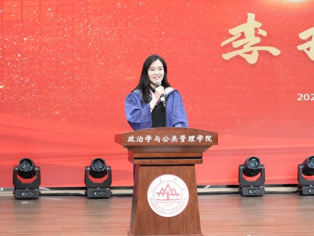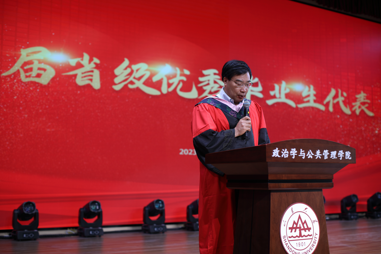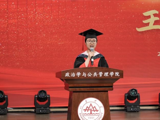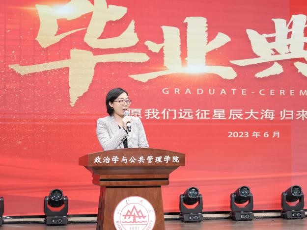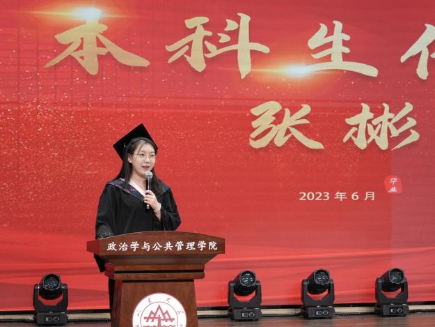 在庄严的《中华人民共和国国歌》声中,8858cc永利2023届毕业生毕业典礼暨学位授予仪式拉开帷幕。校友代表、现任教于上海交通大学国际与公共事务学院的苏若林副教授,回顾了在校学习生活的美好时光,向母校表达了由衷感谢并向全体毕业生表达了诚挚祝福。随后本科生代表张彬、硕士研究生代表郭晓慧和刘硕、MPA代表李振茜和博士研究生代表王昭先后发言,表示将牢记母校“学无止境,气有浩然”的校训,不负“知政为公,厚德笃行”的殷切嘱托,到新时代新天地中去施展抱负、建功立业,争当伟大理想的追梦人,争做伟大事业的生力军,让青春在祖国和人民最需要的地方绽放绚丽之花。