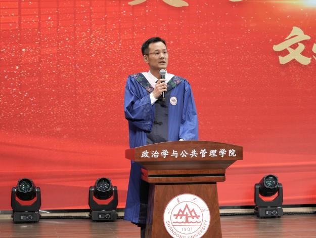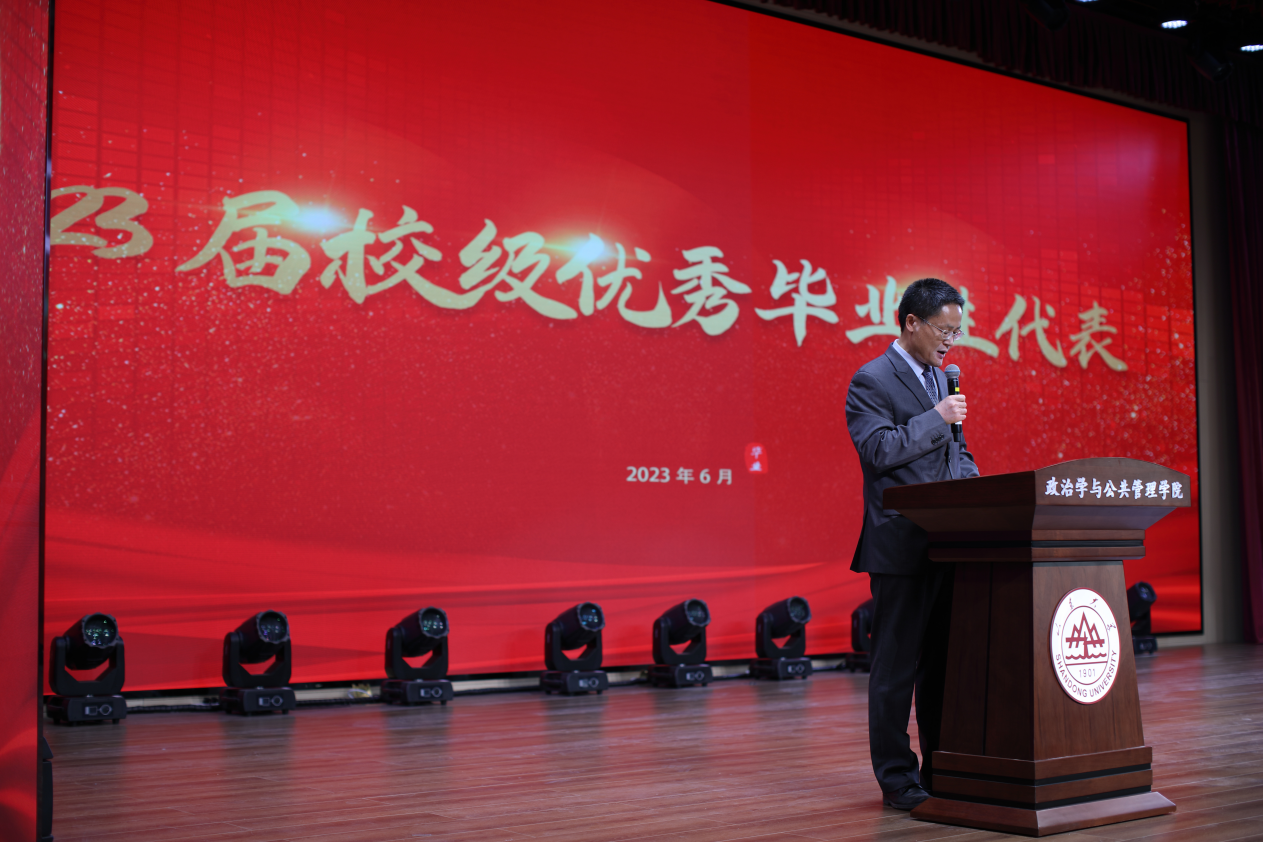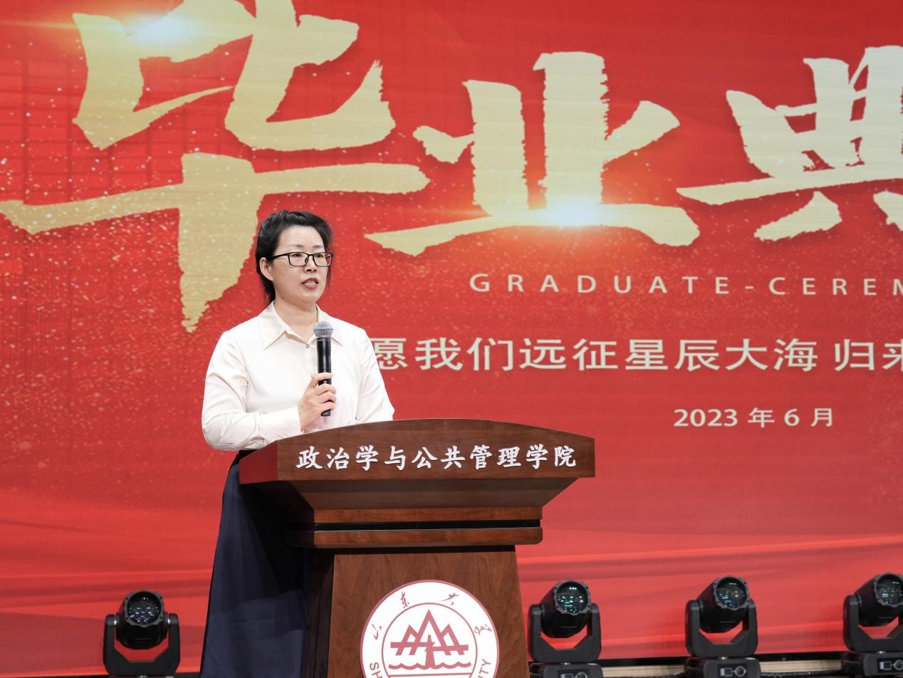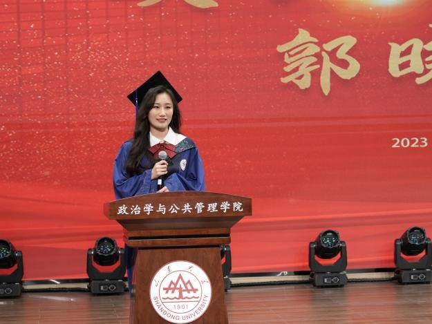 在庄严的《中华人民共和国国歌》声中,8858cc永利2023届毕业生毕业典礼暨学位授予仪式拉开帷幕。校友代表、现任教于上海交通大学国际与公共事务学院的苏若林副教授,回顾了在校学习生活的美好时光,向母校表达了由衷感谢并向全体毕业生表达了诚挚祝福。随后本科生代表张彬、硕士研究生代表郭晓慧和刘硕、MPA代表李振茜和博士研究生代表王昭先后发言,表示将牢记母校“学无止境,气有浩然”的校训,不负“知政为公,厚德笃行”的殷切嘱托,到新时代新天地中去施展抱负、建功立业,争当伟大理想的追梦人,争做伟大事业的生力军,让青春在祖国和人民最需要的地方绽放绚丽之花。