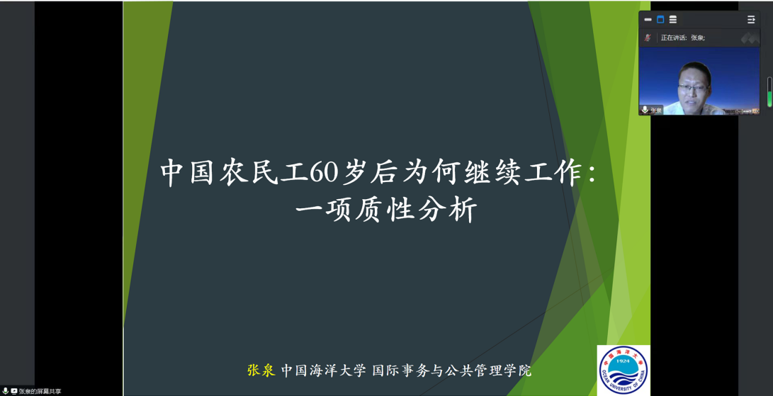 6月6日晚,8858cc永利生活质量与公共政策研究中心学术沙龙第2期顺利举办。中心研究员、中国海洋大学讲师张泉作了题为“中国高龄农民工为何60岁之后继续工作:一个定性分析”的学术讲座。此次活动以线上与线下相结合的方式进行,活动由中心专任研究员褚雷主持,中心主任邢占军、副主任李进涛出席活动,中心专任研究员李梦丹、陈仁兴、周慧等部分师生参与。