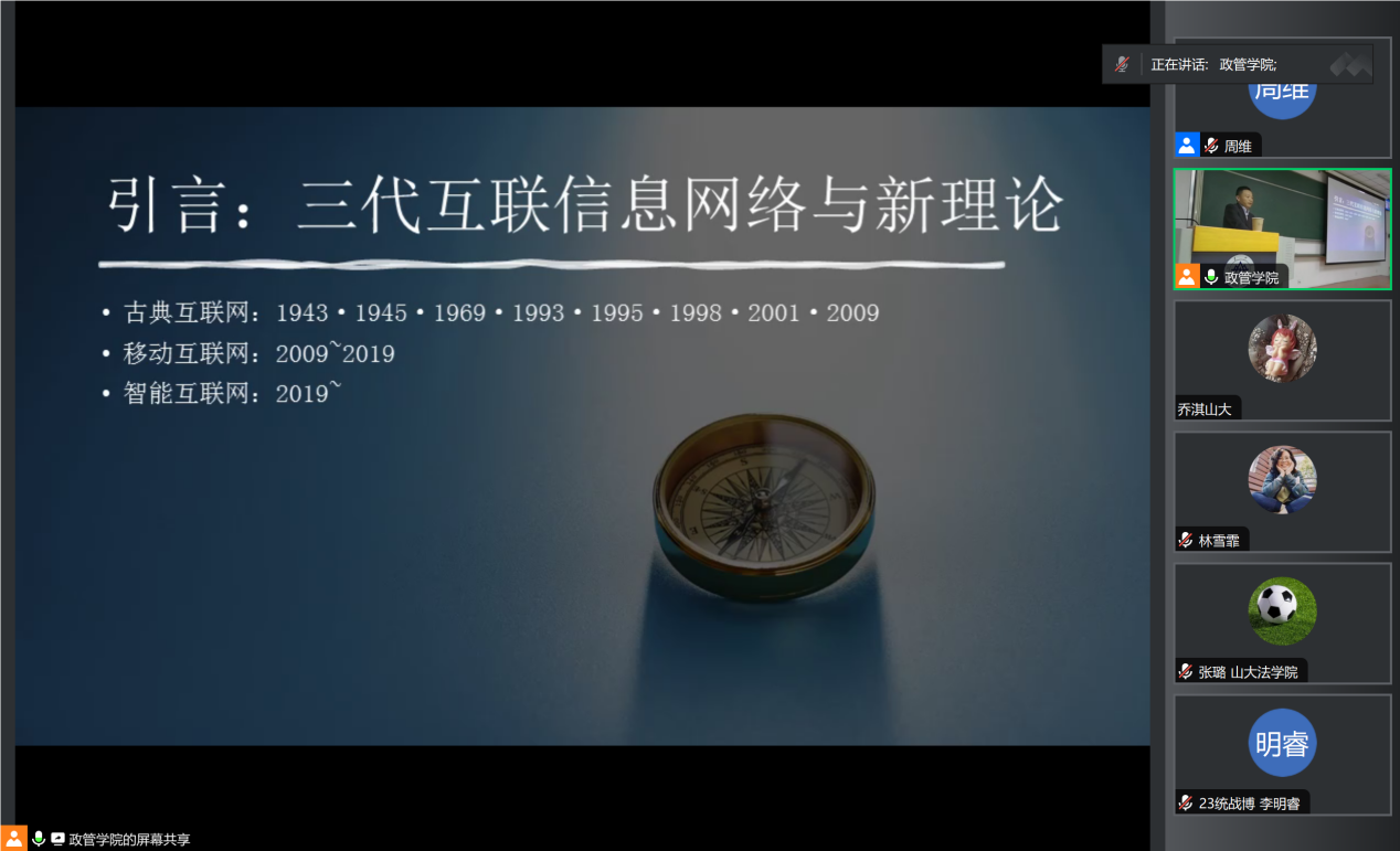 首先,欧树军教授以信息技术的代际演变为线索,参照美国的信息技术发展历史,并结合中国的信息化进程,依次分析了古典互联网、移动互联网和智能互联网的代表性技术与特征。接着,欧树军教授在拉斯韦尔的“5W”理论基础上,进一步构建了一个信息政治的整合性分析框架,对信息政治进行宏观的全景式考察,系统阐明了信息政治的主体、内容、方式、目的以及未来政治趋势等八大维度。最后,欧树军教授对互联网治理的未来走向进行了精彩的理论推演。欧树军教授的深入洞察和系统讲解有助于与会师生以一个更为全面和辩证的视野来看待互联网技术对现代生活与政治的深刻影响,并理性思考互联网信息技术在治理实践中的应用。