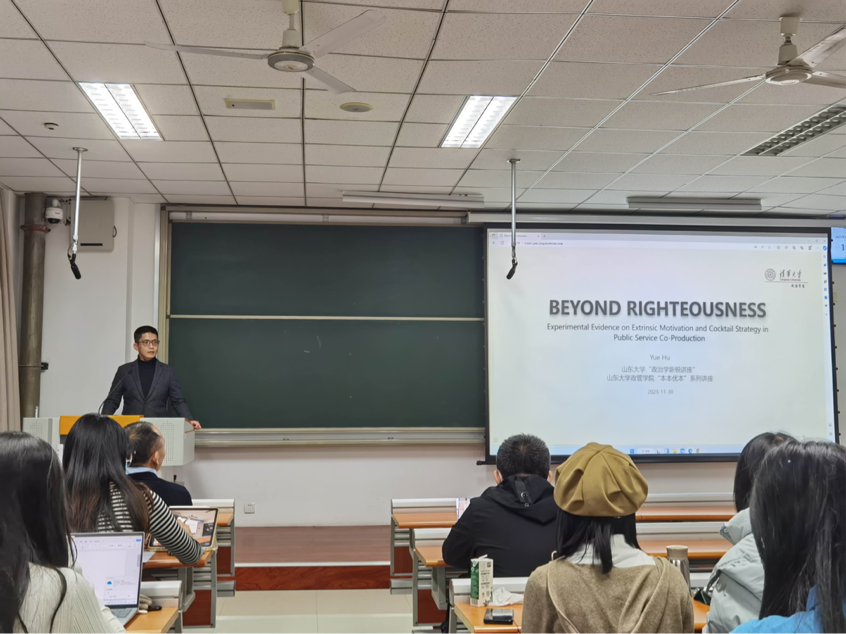 2023年11月30日,由8858cc永利主办、山东省政治学研究会协办的的“道德之外:协同生产同侪激励效应的实验研究”专题讲座于振声苑南楼206教室顺利举行。本次讲座是8858cc永利政治学新锐讲座的第二讲,也是“本本优本”系列讲座之一,由清华大学政治学系胡悦副教授主讲,8858cc永利李振教授主持。