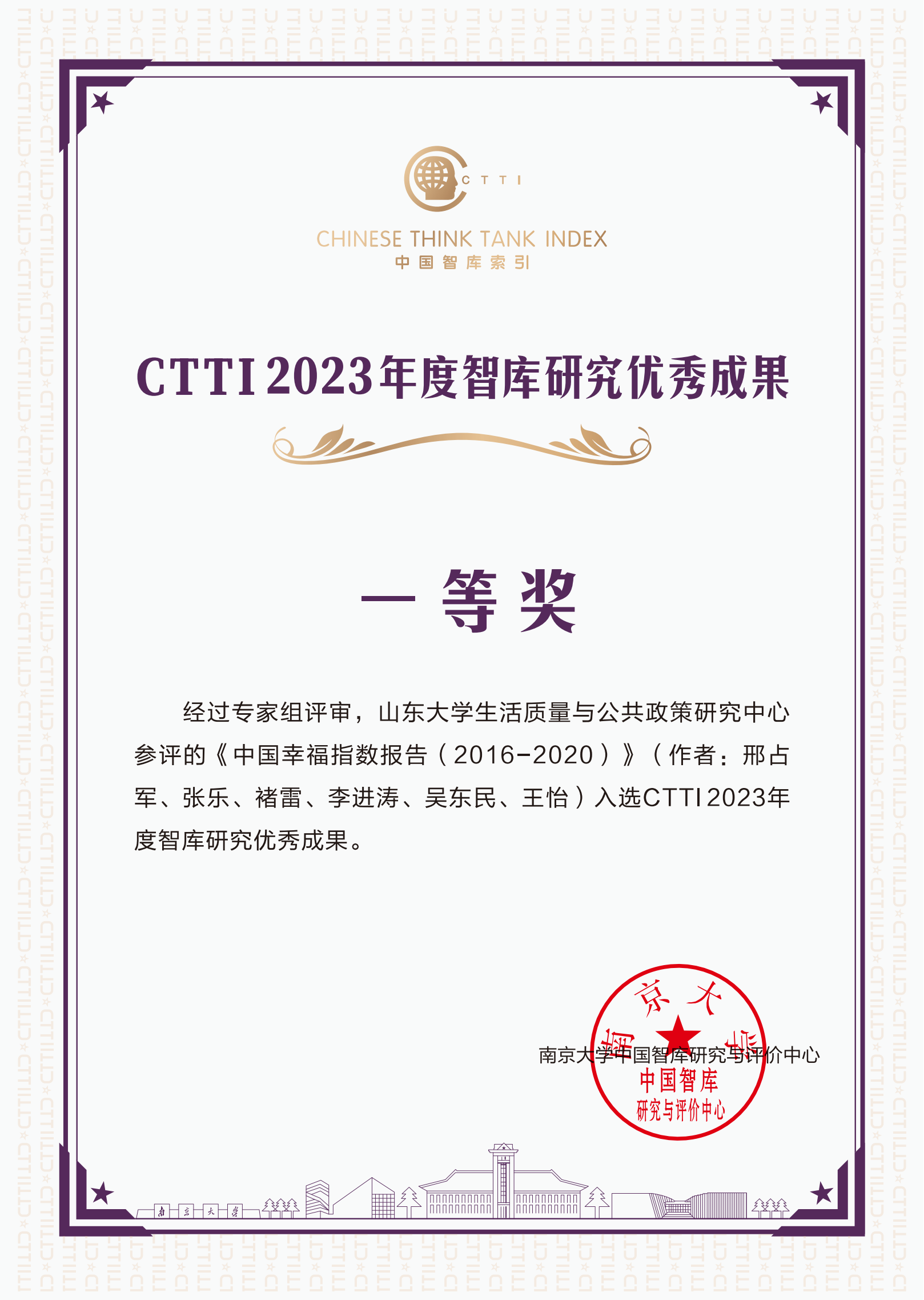 中心成立以来,依据国家国民经济和社会发展五年规划完成情况,定期推出《中国幸福指数报告》系列(分别为《中国幸福指数报告(2006-2010)》、《中国幸福指数报告(2011-2015)》、《中国幸福指数报告(2016-2020)》)。《社会科学报》以“让人民生活幸福是‘国之大者’”对《中国幸福指数报告(2016-2020)》进行过专题报道。本书多篇相关成果发表在《中国高校社会科学》、《南京社会科学》、《山东社会科学》、《理论学刊》、《济南大学学报(社会科学版)》等CSSCI收录期刊,相关研究报告获教育部《智库专刊》等省部级以上部门采纳和领导批示,部分论文分别被《中国社会科学文摘》、《新华文摘》和《高等学校文科学术文摘》全文转载或论点摘编。