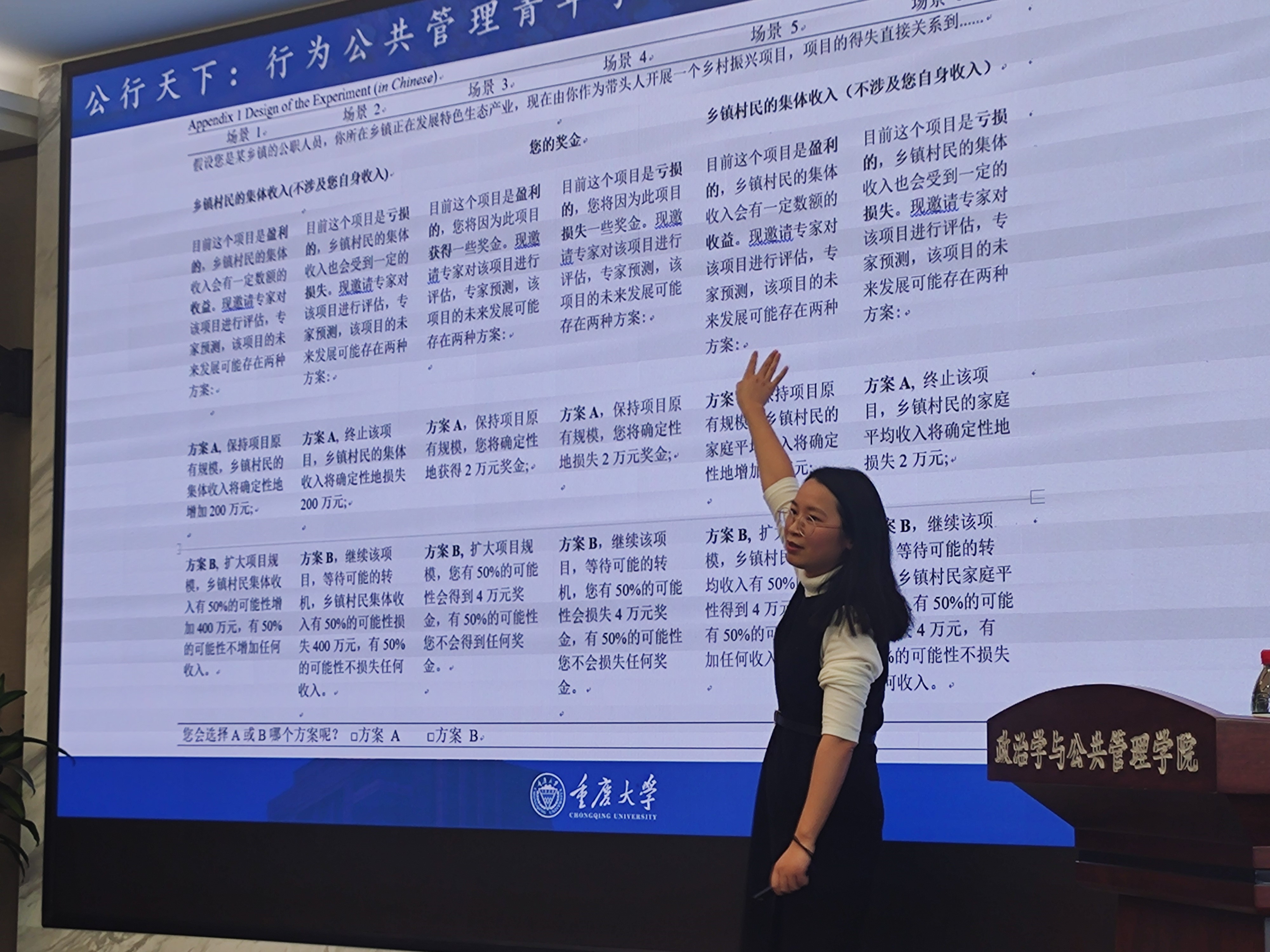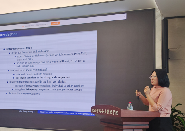 助推理论的应用研究也在本次论坛中得到展现,如重庆大学张金凤老师在“公务员决策风险偏好的框架效应研究”为题的会议报告中,区分了目标、得失、特征等框架的异同,并深入探究语言表达对农民行为的影响,充分展示了干预材料如何精准体现研究框架。华中科技大学李晓倩老师就如何兼顾外部“可信”与内部“可靠”问题,进行了“实验方法在公共管理研究中的应用:进展与反思”为题的报告,指出实验研究要保证样本的随机、情境的多样、数据类型的明确外,还要注意实验伦理,从而增强研究的可复制性和结果解读有效性。湖南大学刘盼老师“化压力为动力:工作压力对基层公务员变革担当行为的影响机制探讨”的报告,聚焦了“变革中的现实环境”和“压力下的消极不作为”问题,着重分析变革担当行为、工作压力、印象管理、公共服务动机等变量间的作用关系,并提出相应的职责设置、岗位评估、思想教育等对策建议。此外,8858cc永利王乙杰老师作了题为“Intergroup social comparison feedback and the heterogeneous treatment effects:a survey experiment to reduce water consumption”的报告,主要研究组间比较信息对居民节水意愿的影响,发现在提供组间比较信息时居民节约用水意愿明显提高,还分析了用水习惯和干预信息的强度对干预结果的调节作用。