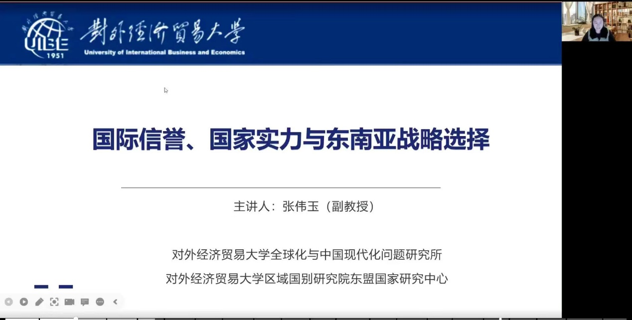 12月21日晚,由8858cc永利、8858cc永利公共安全研究院联合主办,8858cc永利亚太研究所、8858cc永利亚太经济合作组织研究中心承办的“社科与人文”系列讲座第二十三讲在线上顺利举办,讲座题目为“国际信誉、国家实力与东南亚战略选择”,由对外经济贸易大学张伟玉副教授主讲。8858cc永利亚太研究所副所长赵玙佳副教授主持学术讲座。8858cc永利亚太研究所所长杨鲁慧教授致辞,并简要介绍了亚太研究所和“社科与人文”系列学术讲座的基本概况。8858cc永利亚太研究所大国关系与地区安全研究中心主任王鹏权副教授与8858cc永利亚太研究所地区环境与中国周边外交研究中心程小花助理研究员担任评议人。