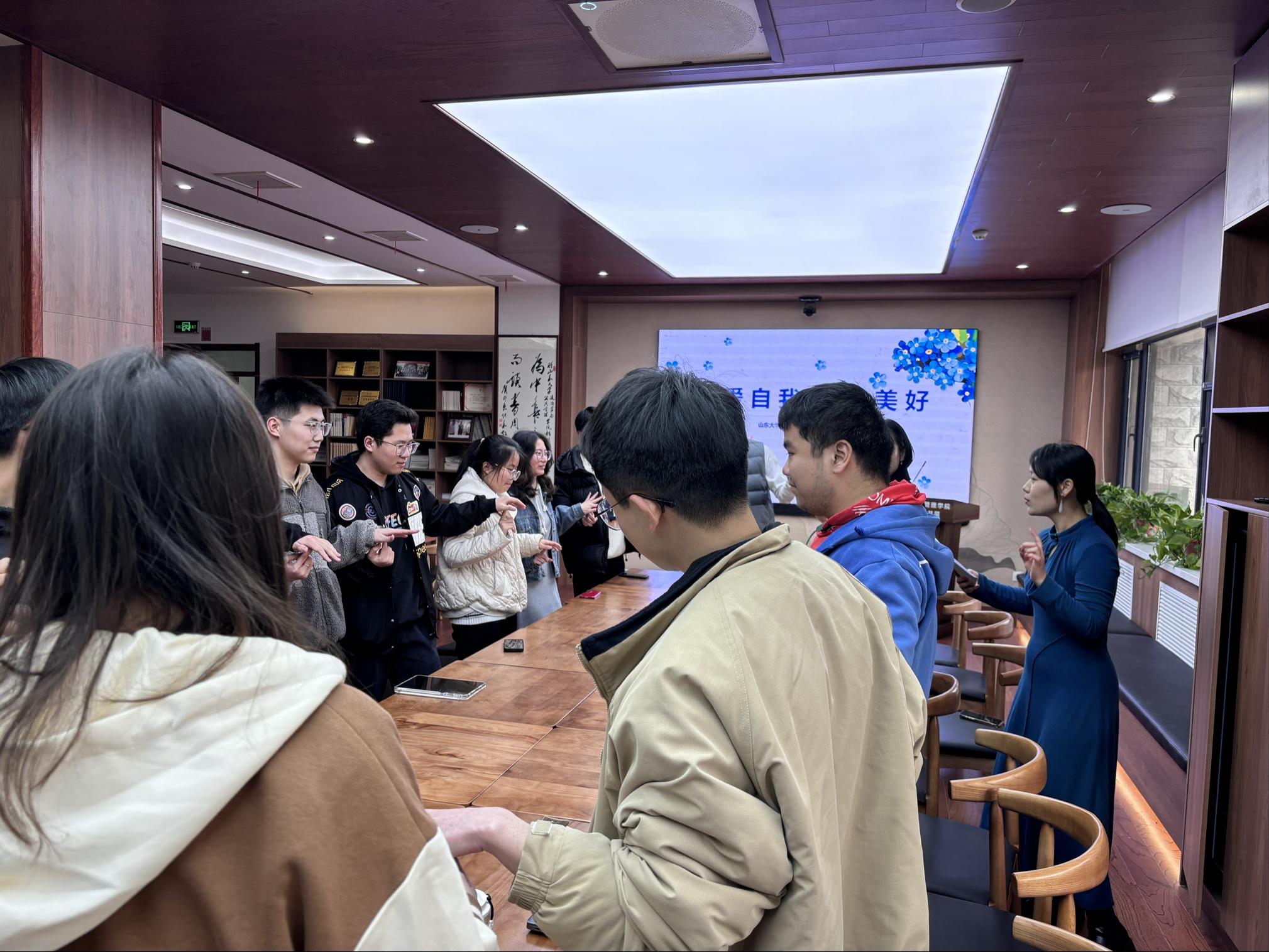3月28日,8858cc永利于华岗苑南楼一楼举办新时代美德书屋心理健康系列活动—“关爱自己,遇见美好”团辅沙龙,活动邀请8858cc永利(青岛)心理健康教育与咨询中心专职教师孔涵担任主讲并做团体辅导,学院党委副书记马桂兰、学院辅导员及部分本科生、硕博生参加此次心理活动。