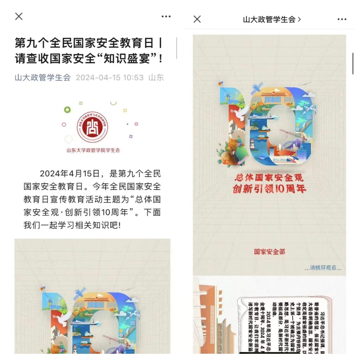 围绕总体国家安全观,学院充分利用线下线上教育资源,通过召开主题班会、专题会议等广泛开展各种形式安全主体教育活动,切实提高国家安全知识,增强国家安全教育的宣传实效。同时,组织同学们观看“千万高校学生同上一堂国家安全教育课”为主题的公开课,并参与“全国大学生国家安全知识答题”活动,使国家安全意识深深根植于每位同学心中。依托学院学生会公众号,发布国家安全知识的图文推送,以生动活泼的方式普及国家安全知识,进一步加强安全宣传工作,引导学生掌握国家安全相关知识和技能,争做国家安全的“宣传者”、“践行者”和“守护者”。