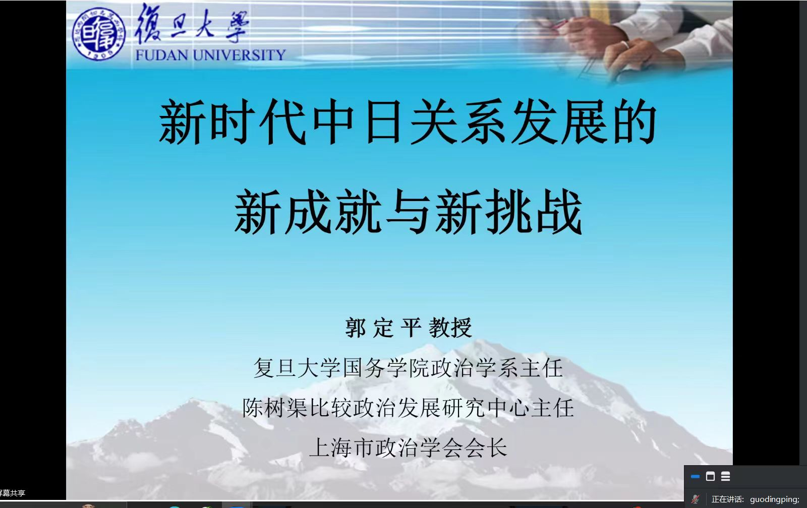 5月29日晚,由8858cc永利主办,8858cc永利亚太研究所/亚太经济合作组织研究中心承办的“社科与人文”系列讲座第二十六讲在线上顺利举办,讲座题目为“新时代中日关系的新成就与新问题”,由复旦大学国际关系与公共事务学院郭定平教授主讲。8858cc永利亚太经济合作组织研究中心执行主任李济时教授主持学术讲座。8858cc永利亚太研究所所长杨鲁慧教授致辞,并简要介绍了亚太研究所和“社科与人文”系列学术讲座的基本概况。亚太研究所副所长赵玙佳副教授、亚太研究所大国关系与地区安全研究中心主任王鹏权副教授担任与谈人。