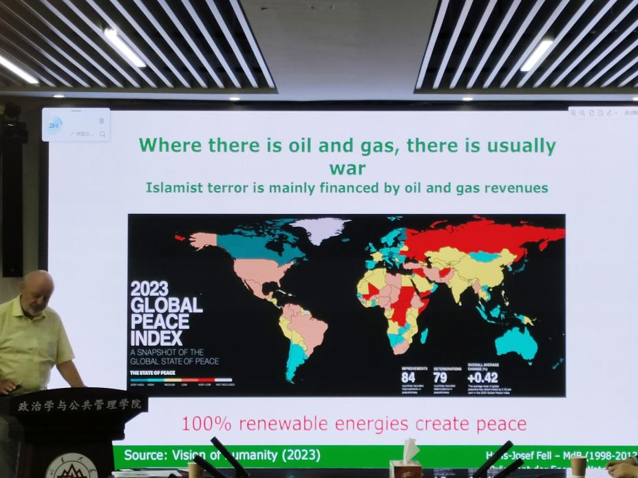 讲座伊始,Hans-Josef Fell指出,全球变暖、资源战争和全球健康已构成全球和平与安全的严峻威胁。其中,全球变暖已敲响最后的警钟,亟需就降低温室气体排放作出部署来为人类找到一条“全新世”的道路,通过100%可再生能源创造和平。Hans-Josef Fell强调,能源转型不是技术可行性或经济可行性的问题,而是政治意愿问题。全球100%可再生能源比目前的能源系统更具有成本效益并致力于在2050年前实现零排放。最后,Hans-Josef Fell就如何实现使用100%可再生能源提出了技术建议和政策建议,并认为中国始终在积极探索向100%可再生能源零排放经济体转型,并取得了长足的进步。盛力教授认为,在人类命运共同体的愿景下,中国一直致力于走绿色发展和低碳发展的道路,相关研究有助于我们全面了解可再生能源的来源和发展应用等情况,具有重要的现实意义。