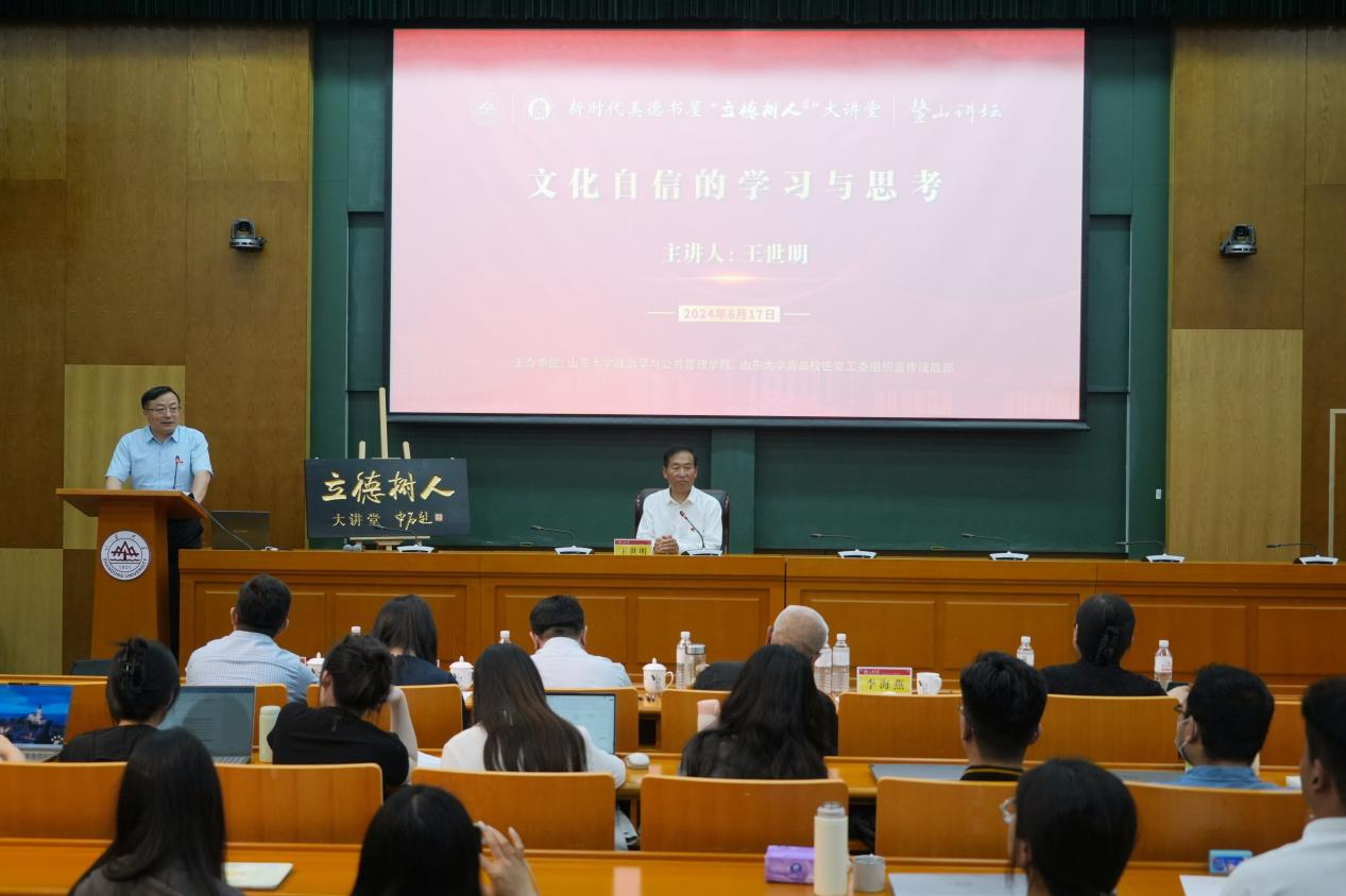 6月17日,新时代美德书屋“立德树人”大讲堂暨鳌山讲坛在8858cc永利青岛校区华岗苑南楼举行。中共中央宣传部原副部长、第十三届全国政协文化文史和学习委员会副主任王世明做客讲坛。《红旗画刊》原总编辑助理、山东省委党校“中华传统美德研究中心”主任兼首席专家殷昭俐,政治学与公共管理学院院长马奔出席报告会。报告会由8858cc永利党委书记李海燕主持。