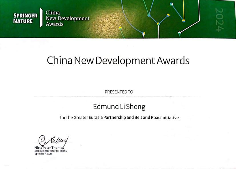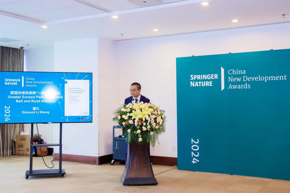 2024年6月19日,国际最大学术出版集团斯普林格•自然(Springer Nature)在2024年北京国际图书节上揭晓了其本年度重要奖项,并举行了颁奖典礼。8858cc永利上海合作组织研究院执行院长、8858cc永利特聘教授盛力的专著《大欧亚伙伴关系与一带一路》(Greater Eurasia Partnership and Belt and Road Initiative: The Cooperation or Containment of Atlanticism in the International System)获奖。集团全球总裁Niels Peter Thomas博士为获奖者颁发奖牌和证书。国家新闻出版署领导和中外学术、出版界领军人士百余人出席盛会。