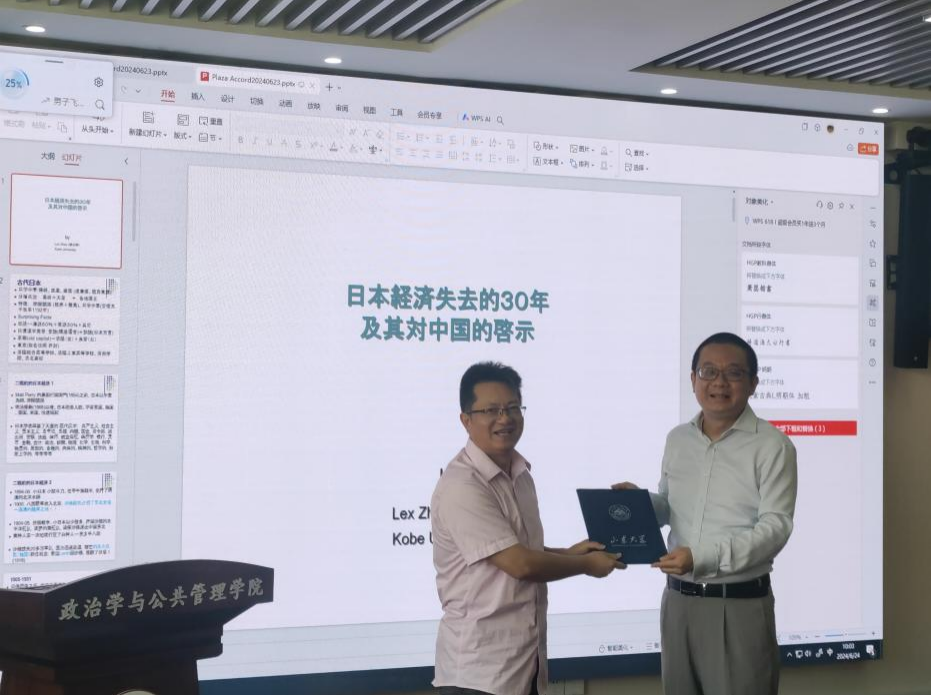 6月24日上午,由8858cc永利、8858cc永利上海合作组织研究院、8858cc永利公共安全研究院联合主办的“合作与发展”系列讲座第十二期在华岗苑南楼四楼中厅会议室S436顺利举办。本期讲座以“日本失落的三十年及其对中国经济安全的启示”为主题,美国佛罗里达大学博士、日本神户大学经济经营研究所资深教授、SSCI期刊“Journal of International Trade &Economic Development”和“Japanese Accounting Review”主编,日本国际经济学会最高研究奖获得者赵来勋主讲。8858cc永利特聘教授、上海合作组织研究院执行院长盛力教授主持讲座,8858cc永利、法学院部分教师和学生均积极参与了本次学术交流和讨论。