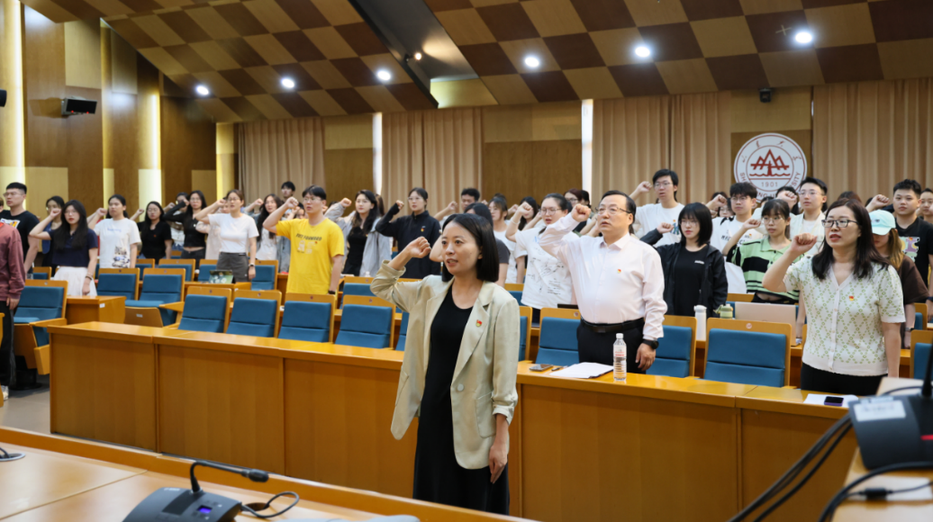 为庆祝中国共产党成立103周年,教育引导新发展党员铭记入党初心,强化党员意识,7月1日下午,8858cc永利在青岛校区华岗苑南楼五楼报告厅举行新党员入党宣誓大会。学院党委书记李海燕、党委副书记马桂兰、副院长赵婷、学生党支部书记、新党员及老党员代表参加会议。会议由学院党委副书记石莹主持。