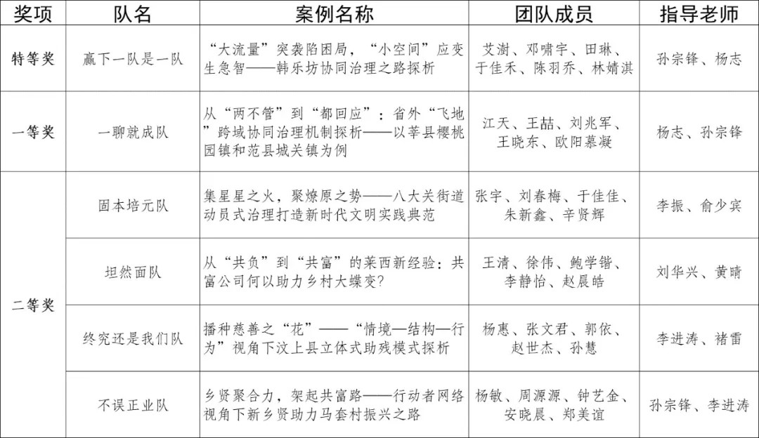 其中,由孙宗锋教授、杨志老师共同指导的“赢下一队是一队”(队员:艾澍、邓啸宇、田琳、于佳禾、陈羽乔、林婧淇)斩获大赛最高奖项“特等奖”,“一聊就成队”(队员:江天、王喆、刘兆军、王晓东、欧阳慕凝)斩获大赛“一等奖”,两队案例《“大流量”突袭陷困局,“小空间”应变生急智——韩乐坊协同治理之路探析》《从“两不管”到“都回应”:省外“飞地”跨域协同治理机制探析——以莘县樱桃园镇和范县城关镇为例》荣获“最佳案例奖”。孙宗锋教授、杨志老师荣获“最佳指导教师”称号,江天同学荣获“最佳表现奖”。