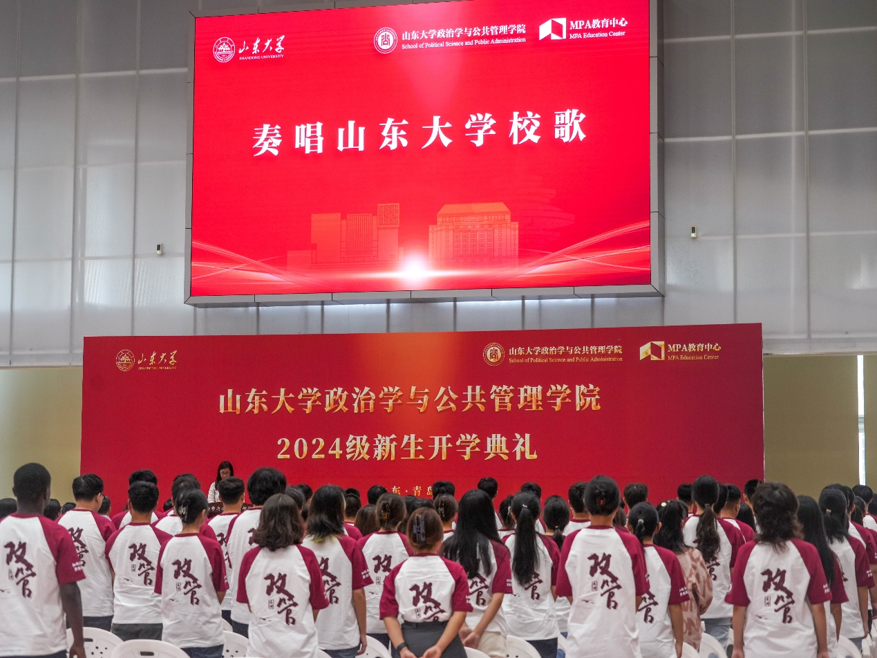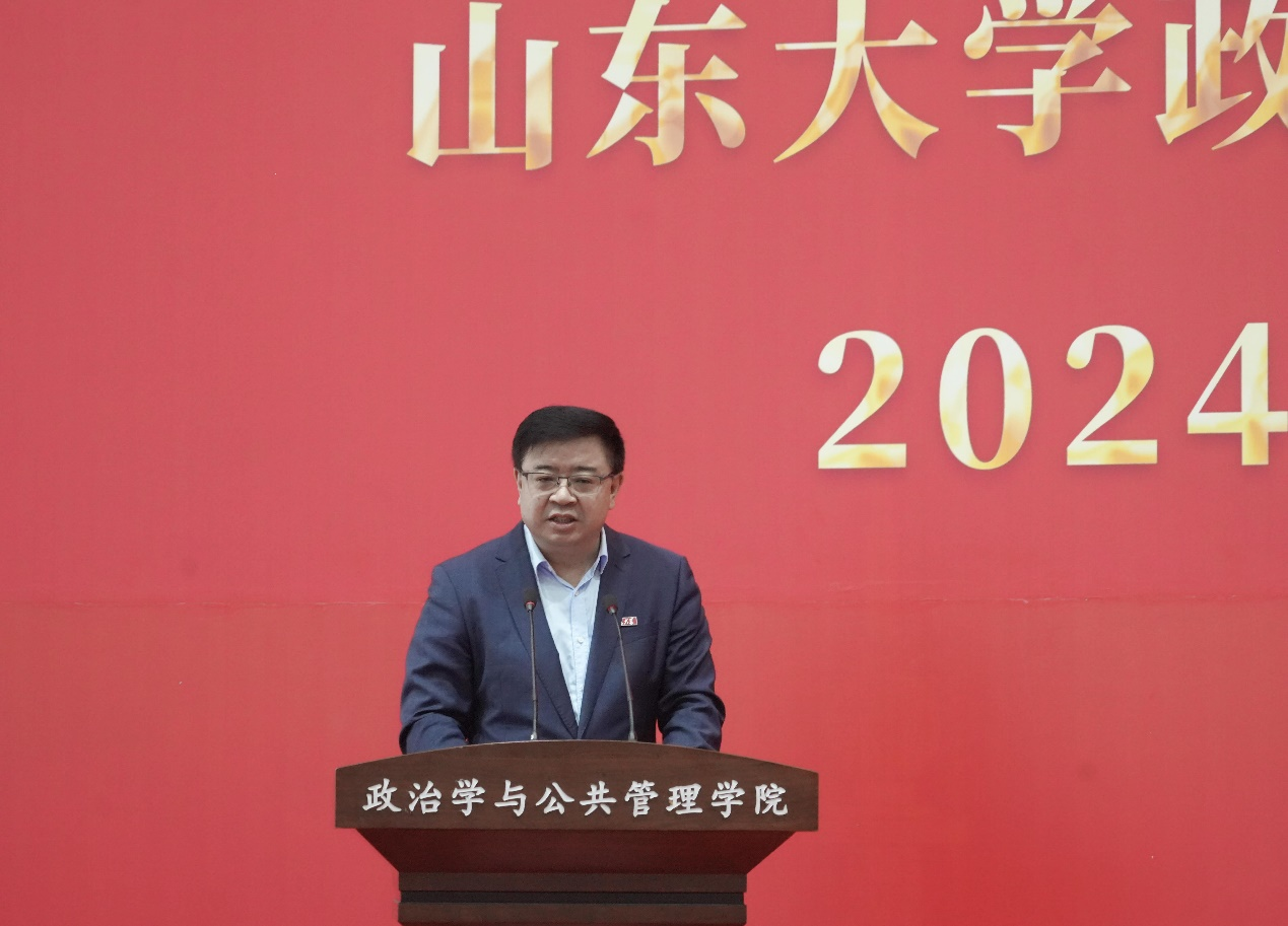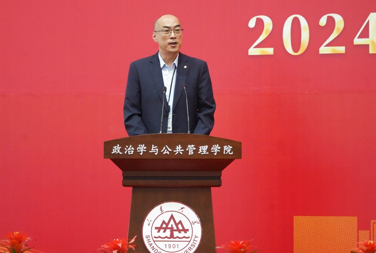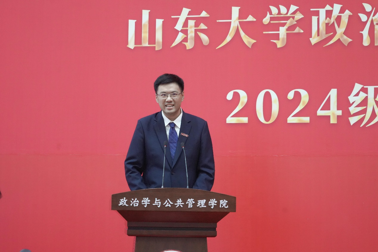 典礼在庄严的国歌声中拉开帷幕。马奔首先代表学院对2024级867名新生的到来表示热烈欢迎,并向步入人生新阶段的同学们提出了六点殷切希望:一是要培养变革性思维能力,用辩证的、批判的、合作的思维看待问题,学会独立思考、严谨求真、合作共赢;二是要练就强健的体魄,珍惜校、院宝贵的体育资源,“学在山大,快乐成长”,把学术探索与体育锻炼并重,实现全面发展;三是要拥有美丽的心灵,涵养共情的能力,既要在知识的殿堂里悟道明理,又要在心灵的田野上播种善良与希望,用实际行动诠释“知政为公,厚德笃行”的院训;四是要形成健全的人格,学会自我认知与接纳,懂得情绪管理与调节,培养坚毅不拔的毅力,迎接学习和生活中的各种挑战;五是要保持求知的欲望,去追寻那些尚未被发现的真理,敢于挑战权威、质疑既有观念,在学术的旅程中不畏登攀;六是要拓展全球视野,既要有“家国情怀”,又要有“世界担当、全球气度”,培养开放的思维,提高全球胜任力,为未来全球事务做出积极的贡献。