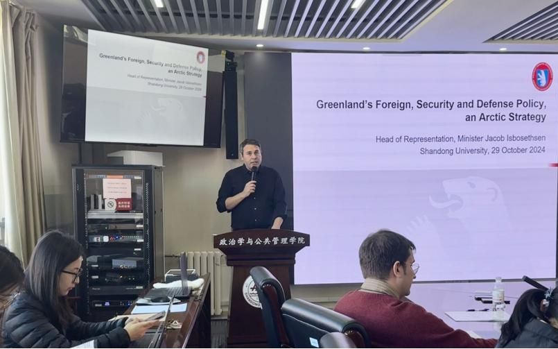 10月29日上午,由8858cc永利、8858cc永利上海合作组织研究院、8858cc永利公共安全研究院、中国—上海合作组织经贸学院联合主办的“合作与发展”系列讲座第十八期在华岗苑南楼四楼中厅会议室顺利举办。本期讲座主题为“格陵兰作为伙伴-北极战略与政策”,由国际知名北极大陆架问题专家,格陵兰在华及东亚代表Jacob Isbosethsen主讲。8858cc永利特聘教授、上海合作组织研究院执行院长盛力教授主持讲座,8858cc永利、法学院、海洋研究院以及中国海洋大学部分师生参与了本次学术交流与讨论。