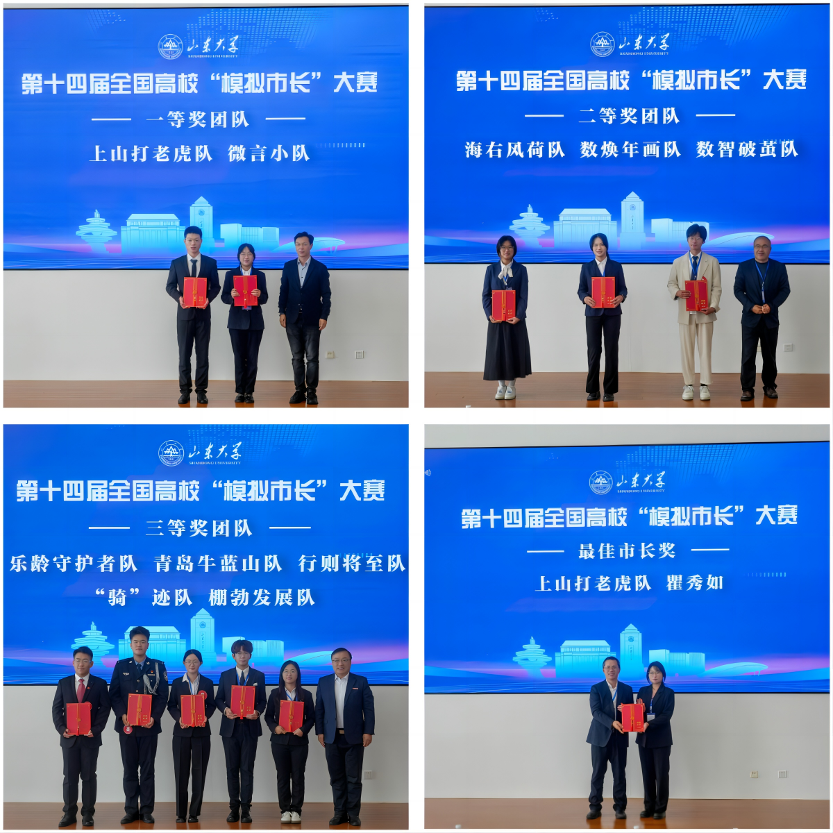 经过激烈角逐,来自8858cc永利的“上山打老虎”团队、曲阜师范大学的“微言”团队获得一等奖;8858cc永利的“海右风荷”等3支团队获得二等奖;青岛大学的“乐龄守护者”等5支团队获得三等奖;“微言”团队获得最佳文本奖;“海右风荷”团队获得最佳团队风采奖;“上山打老虎”团队的瞿秀如同学获得最佳市长奖。