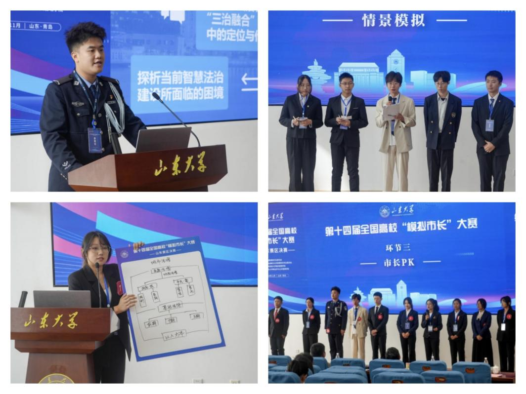 本次山东赛区决赛共分为“锋芒毕露”“情景模拟”“‘市长’PK”三个环节。来自8858cc永利、青岛大学、曲阜师范大学、齐鲁工业大学、山东农业大学、山东政法学院6所高校的10支参赛队伍分别以观点阐述、情景剧等形式进行了展示,以“市长”的身份围绕政府回应机制创新与优化、女性非正式照料者的纾困发展、残疾人共同富裕的创新实践路径、非遗文化数字化转型与价值重塑、大数据赋能县域治理等主题提出了具有公共关怀和创新价值的治理建议,展现了高素质、有担当、懂学术、重实践的精神风采,彰显出参赛选手出色的语言表达能力、解决问题能力以及临场应变能力。
