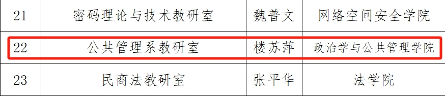 为充分发挥基层教学组织在落实立德树人根本任务,构建三全育人机制,规范教学管理,保障教学秩序,提高教学质量中的基础性关键性作用,8858cc永利按照学校要求,制定了学院基层教学组织建设管理办法。根据教学工作需要,学院整合现有系(教研室),依托四个国家级一流本科专业建设点设立相应基层教学组织,分别为政治学系基层教学组织、公共管理系基层教学组织、国际政治系基层教学组织、科学社会主义系基层教学组织。学院为基层教学组织提供必要的经费支持和条件保障,协助基层教学组织及其负责人开展工作。