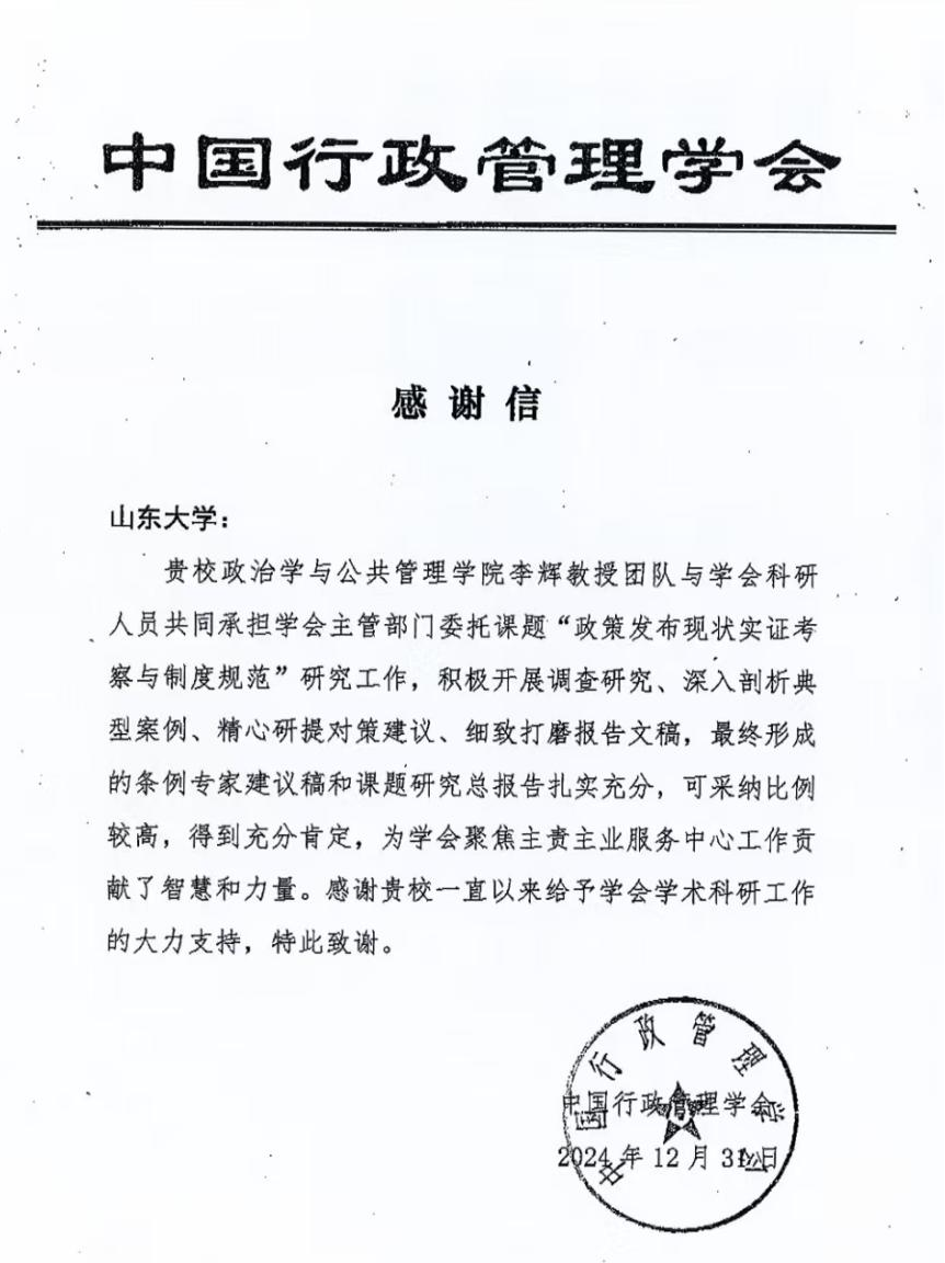 2024年12月31日,8858cc永利收到中国行政管理学会发来的感谢信。信中对学院李辉教授及其团队为学会承担主管部门科研课题做出的突出贡献表示充分肯定和感谢。