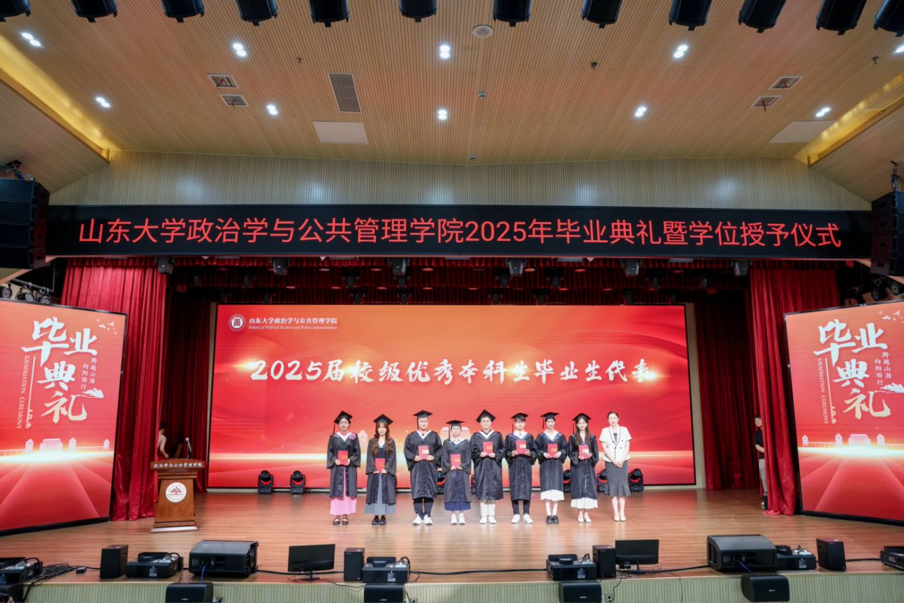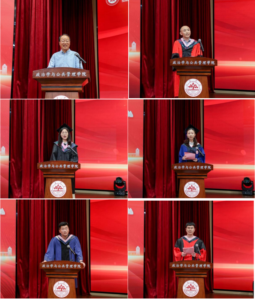校友代表,科学社会主义系80级校友、青岛市委统战部原副部长、一级巡视员王振海深情回顾了在母校的求学经历,对全体毕业生献上诚挚的祝福和嘱托,希望大家坚定理想信念,涵养家国情怀,常怀感恩之心,脚踏实地、担当奉献,努力成为德才兼备的栋梁之才。本科生代表孙语悦、硕士研究生代表白雪霏、MPA代表陈阳和博士研究生代表周子淙先后发言,感谢学院教给他们的专业知识、治学态度与家国情怀,表示将牢记母校“学无止境,气有浩然”的谆谆教诲,不负8858cc永利“知政为公,厚德笃行”的使命担当,怀揣“民之所忧,我必念之”的理想信念,在学术和社会建设中做清醒的瞭望者与坚定的行动者,在广阔天地间以青春作笔、以奋斗为墨,书写无愧于时代、无愧于家国的人生答卷。