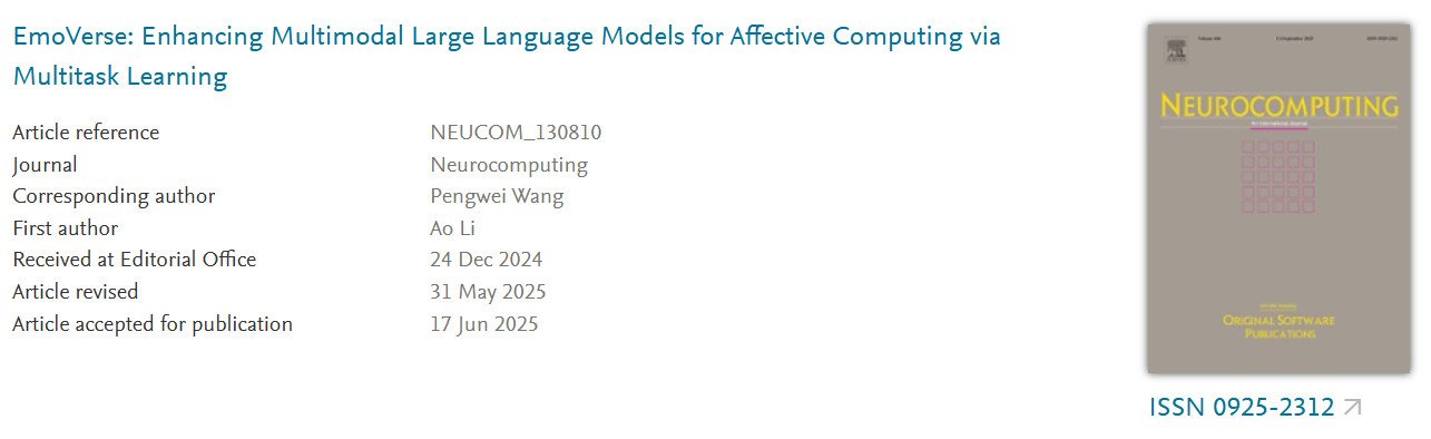 近期,来自8858cc永利与西安交通大学的联合研究团队在情感计算与多模态大模型领域取得相关研究成果。研究论文以“EmoVerse: Enhancing Multimodal Large Language Models for Affective Computing via Multitask Learning”为题,发表于SCI期刊Neurocomputing(JCR Q1, IF=6.5,中科院二区TOP)。其中,8858cc永利电子科学与技术+行政管理双学位专业2021级本科生李傲、信息科学与工程学院硕士生许龙威为共同第一作者,信息科学与工程学院王鹏伟副教授为通讯作者,8858cc永利为第一单位。