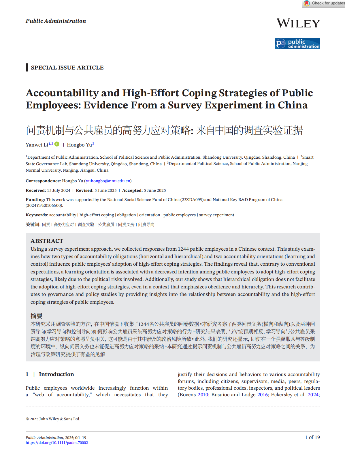 近日,8858cc永利李延伟教授作为第一作者在公共管理顶级期刊Public Administration(PA)在线发表题为《Accountability and High-Effort Coping Strategies of Public Employees: Evidence From a Survey Experiment in China》的学术论文。