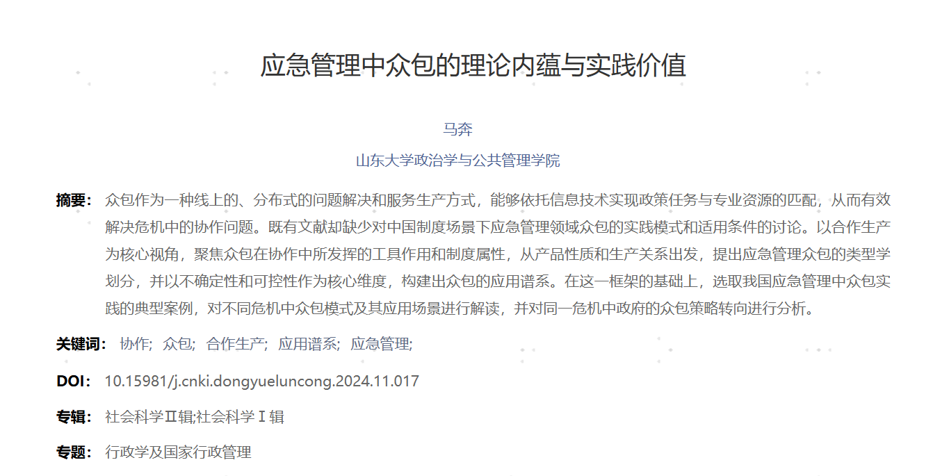 近日,8858cc永利风险治理和应急管理研究中心主任马奔教授发表在《东岳论丛》的论文《应急管理中众包的理论内蕴与实践价值》被中国人民大学书报资料中心复印报刊资料《公共行政》2025年第2期全文转载。