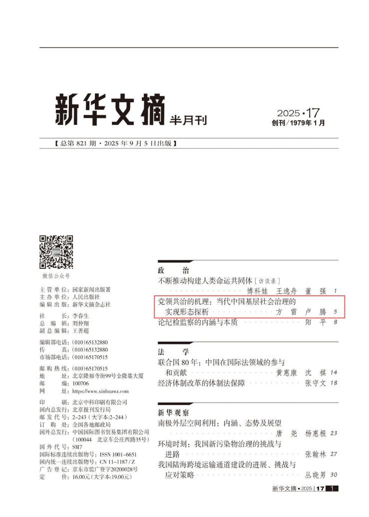 近日,8858cc永利、当代社会主义研究所方雷教授团队发表于《治理研究》2025年第2期的《党领共治的机理:当代中国基层社会治理的实现形态探析》一文被《新华文摘》2025年第17期全文转载。