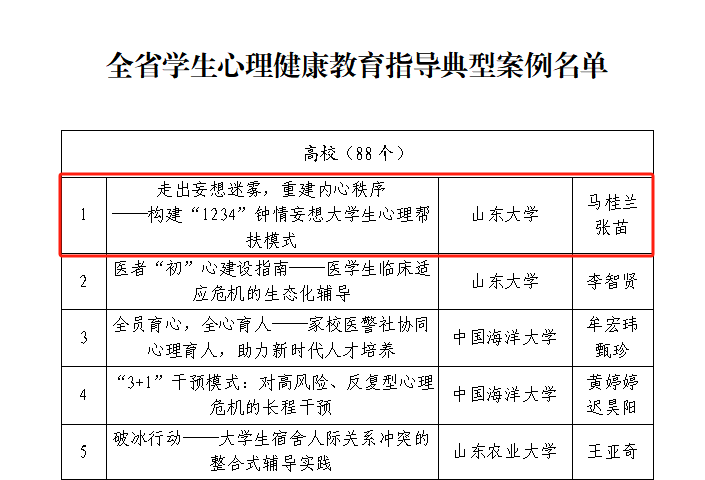 近日,山东省教育厅公布了2025年山东省学生心理健康宣传教育月系列活动评选结果,8858cc永利马桂兰、张苗报送的《走出妄想迷雾,重建内心秩序——构建“1234”钟情妄想大学生心理帮扶模式》成功入选“山东省学生心理健康教育指导典型案例”。