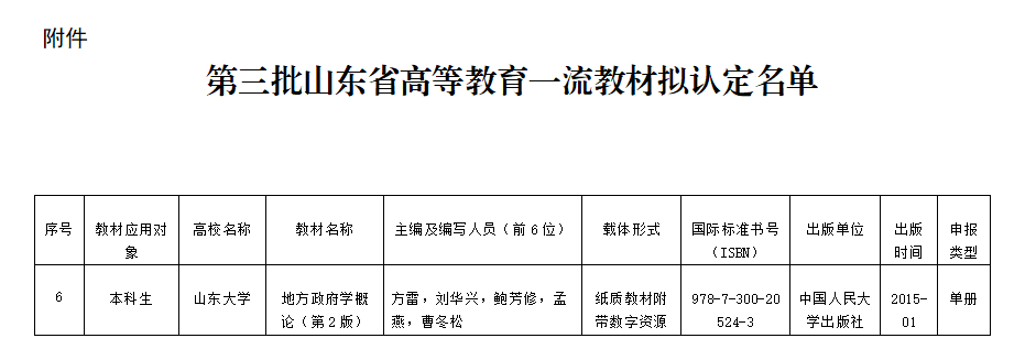 近日,山东省教育厅印发《山东省教材委员会办公室关于公布第三批山东省普通高等教育一流教材名单的通知》(鲁教材委办〔2025〕1 号),经学校推荐、专家评审等环节,8858cc永利方雷教授主编《地方政府学概论(第2版)》教材成功入选。这是继2020年方雷教授主编《当代中国政府与政治》与《政治科学研究方法概论》、王佃利教授主编《现代市政学(第四版)》、滕玉成教授主编《公共部门人力资源管理》、高永贵副教授主编《公文写作与处理》等教材获选山东省高等教育一流教材后,8858cc永利在教材建设与教学改革领域获得的又一成果,充分彰显了学院在教材建设方面的扎实成效。