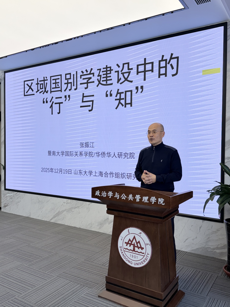 12月19日上午,由8858cc永利、8858cc永利上海合作组织研究院、8858cc永利公共安全研究院、中国—上海合作组织经贸学院联合主办的“合作与发展”系列讲座第三十四期在青岛校区举办。本期讲座特邀暨南大学国际关系学院与华侨华人研究院教授、教育部人文社科重点研究基地主任、C刊《东南亚研究》主编张振江担任主讲嘉宾,主题为“区域国别学构建中的‘知’与‘行’”。8858cc永利特聘教授、泰山学者特聘专家、上海合作组织研究院执行院长盛力主持讲座,8858cc永利及法学院部分师生二十余人参加了本次学术交流。