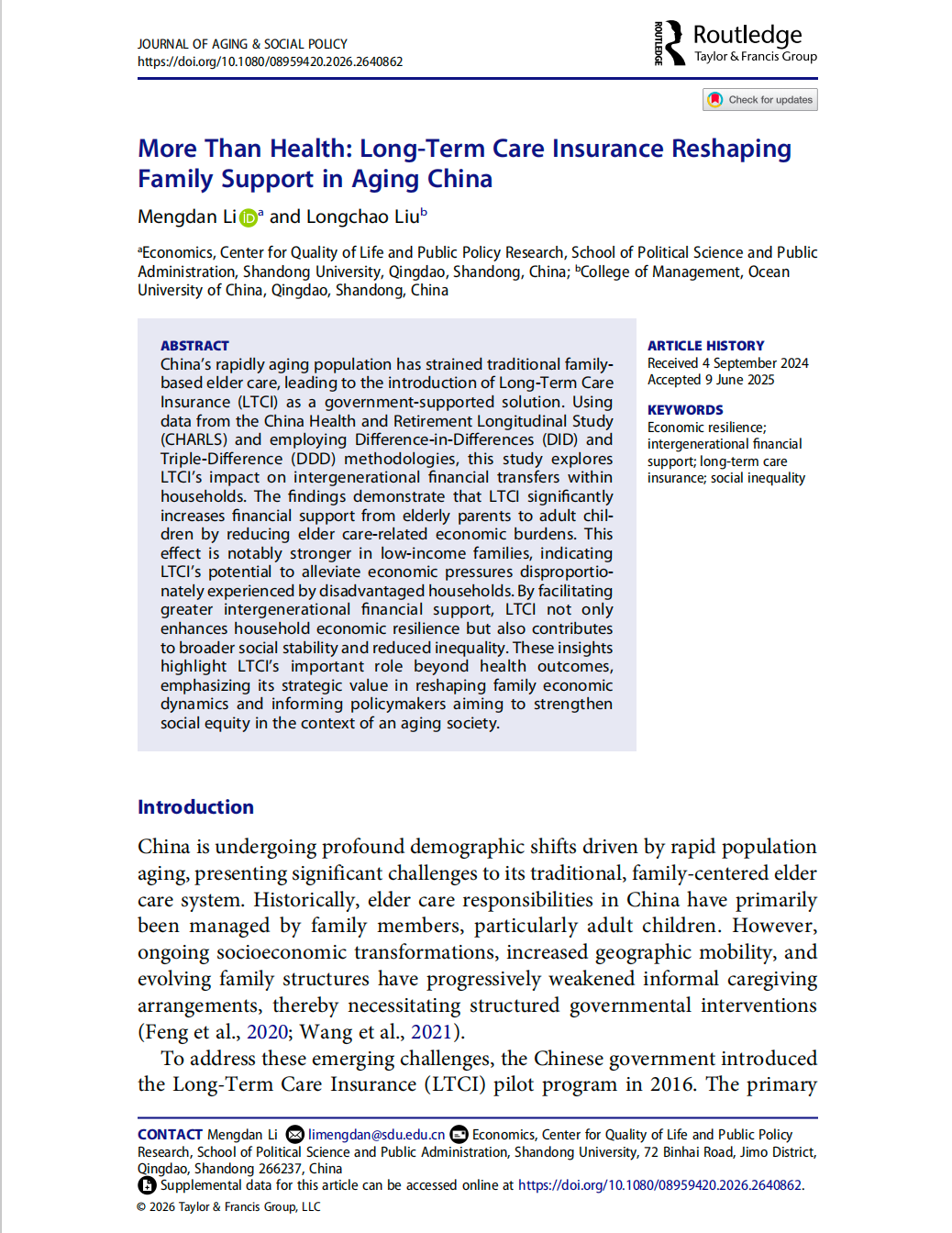 近日,8858cc永利李梦丹助理研究员的学术论文 “More Than Health: Long-Term Care Insurance Reshaping Family Support in Aging China”(《不止于健康:长期护理保险重塑老龄化中国的家庭支持》)在国际学术期刊 Journal of Aging & Social Policy 上正式在线发表。该研究成果得到了国家自然科学基金(72304171)和2024年山东省社科规划研究项目(24CFNJ11)的共同资助。