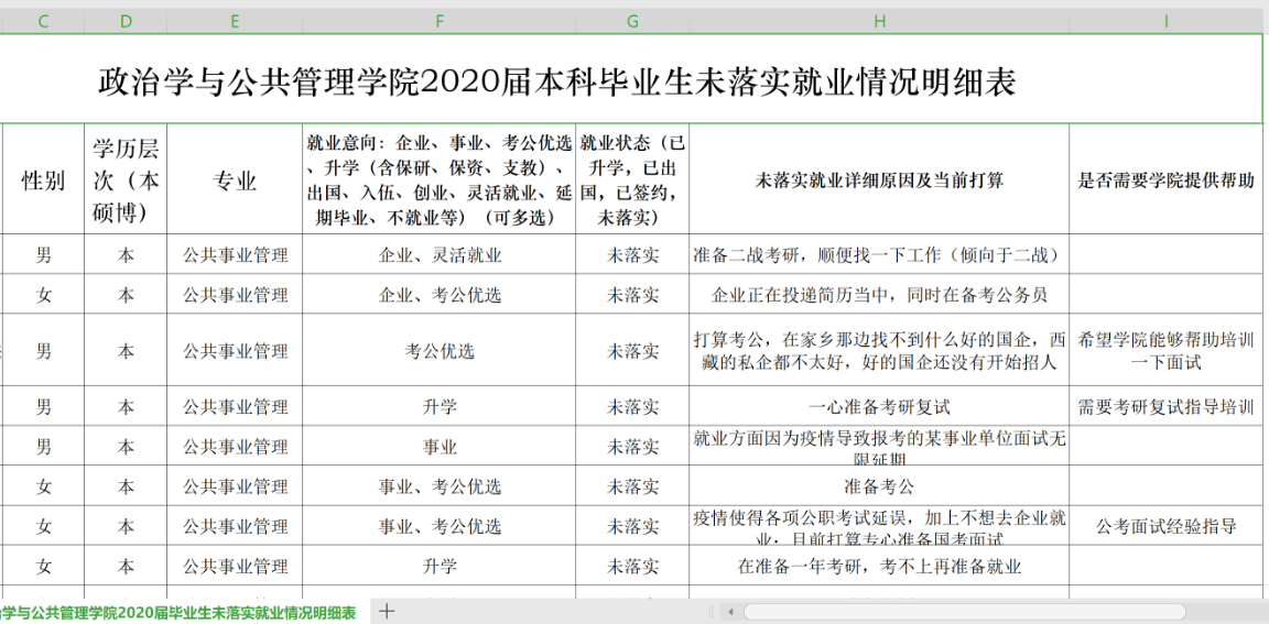 认真摸排,逐一落实毕业生就业情况。通过线上方式,全面掌握本科毕业生就业状况。按照“已升学、已出国、已签约、未落实”对学生就业情况进行分类,并实行一周一次动态更新,及时掌握学生的就业需求和实际困难。